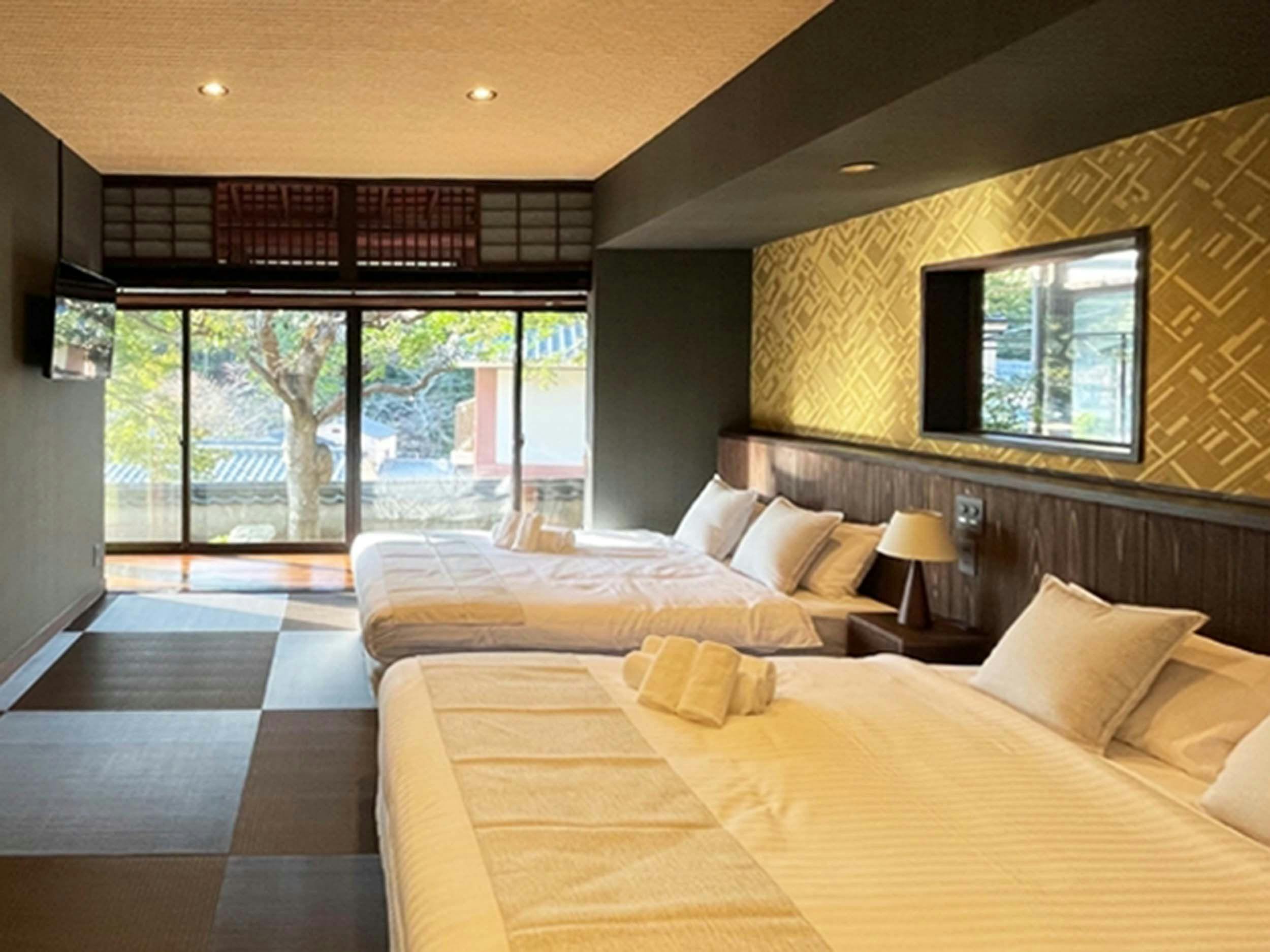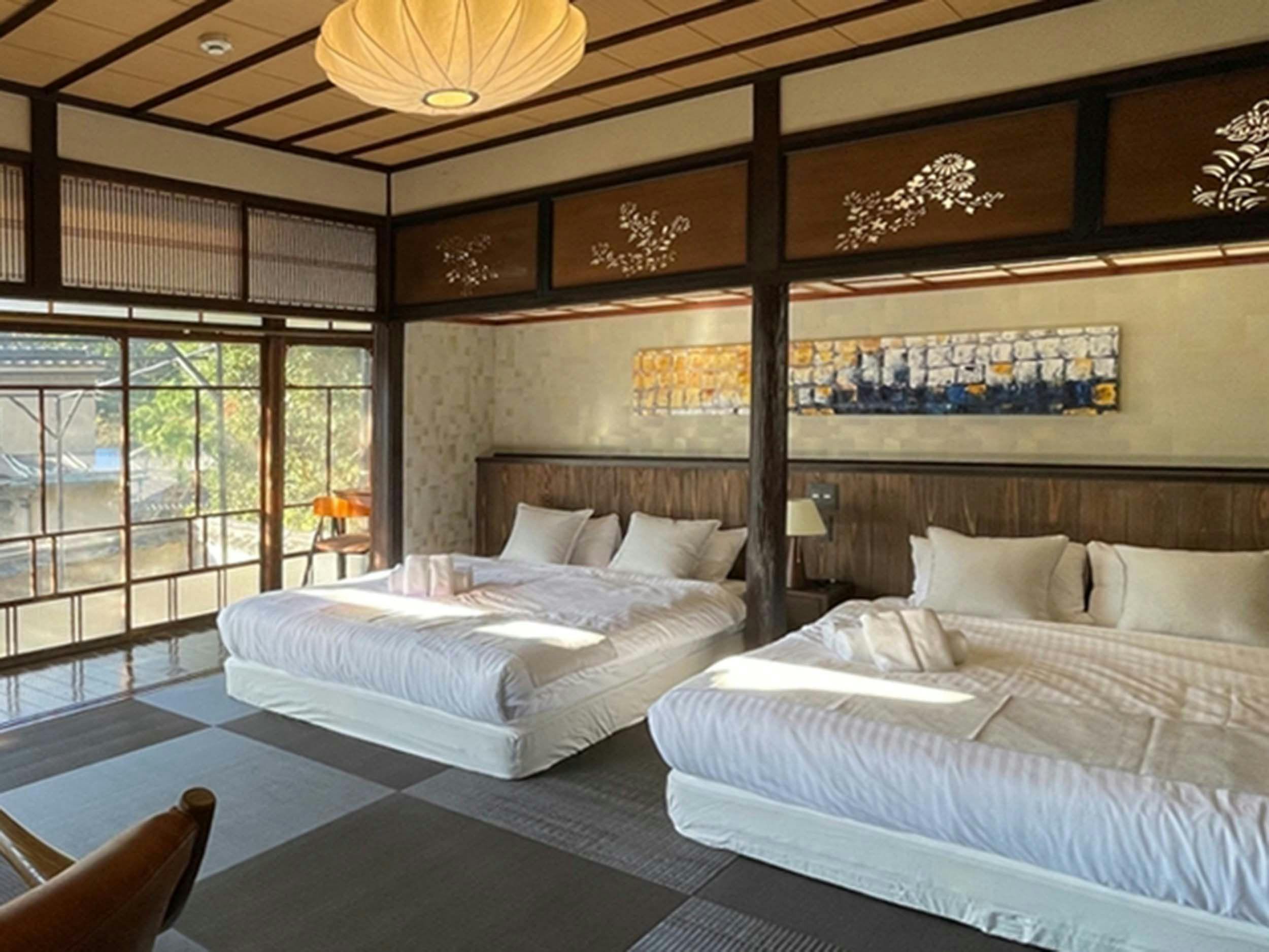 【客室】「趣きの間(和室)」「寛ぎの間(寝室)」「癒しの間(寝室)」「集いの間(リビングダイニング)」の4室は、古民家の梁や柱に見る日本の伝統美と現代のモダンテイストを融合させた和モダンを感じる空間です。【お風呂】満天の星を眺めながら、澄みきった空気を感じる宿自慢の半露天風呂。お二人でもゆったりと利用できるお風呂はプロジェクター付きです。