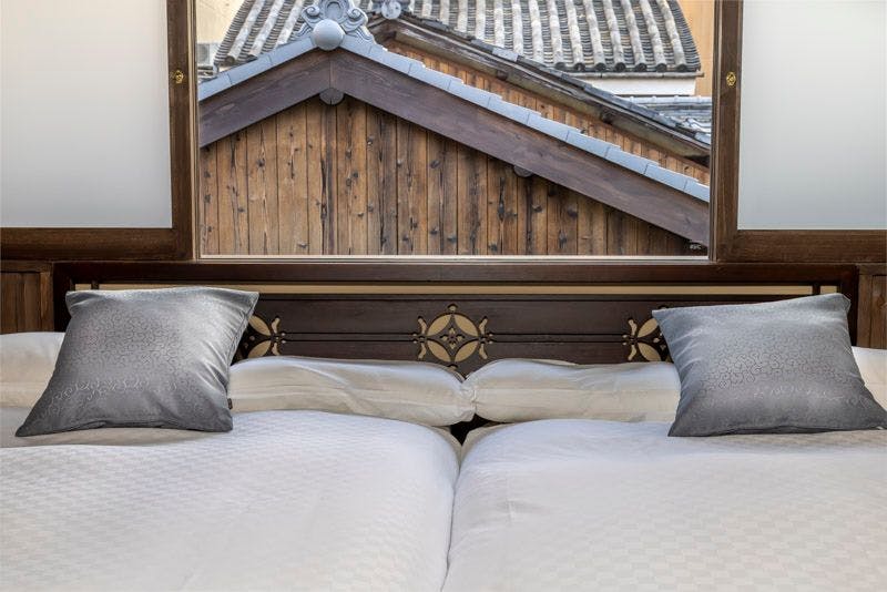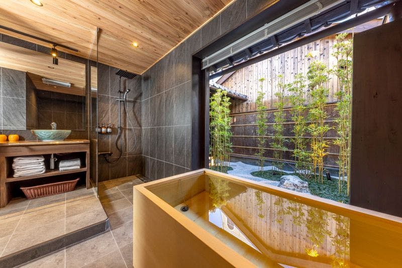 祇園の中心地に佇む 大人の隠れ宿庭を眺めて過ごせるラウンジの平屋と小竹揺らめく中庭を挟んで建つ2階建ての町家二棟を行き来しながら流れる贅沢な時間