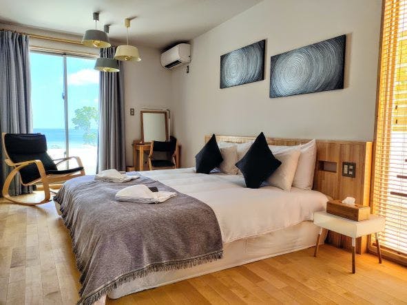 スマートTV(43インチ、ネットフリックスやユーチューブ付き)、11KG洗濯機、乾燥機(洗剤・柔軟剤あり)、wifi無料、エアコン(全部屋)、アイロン、ライフジャケット付きのシュノーケルセット(有料)、二人乗りカヤック(有料)、防水バック