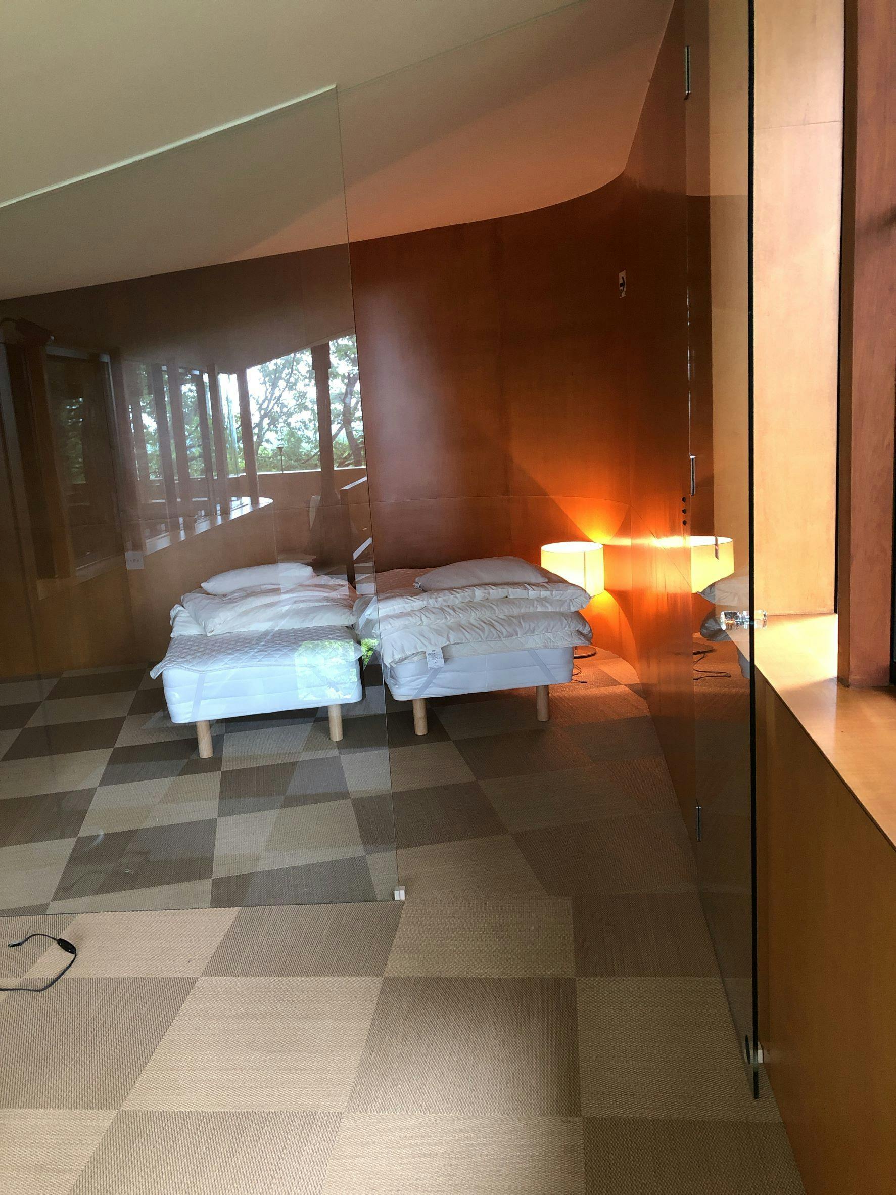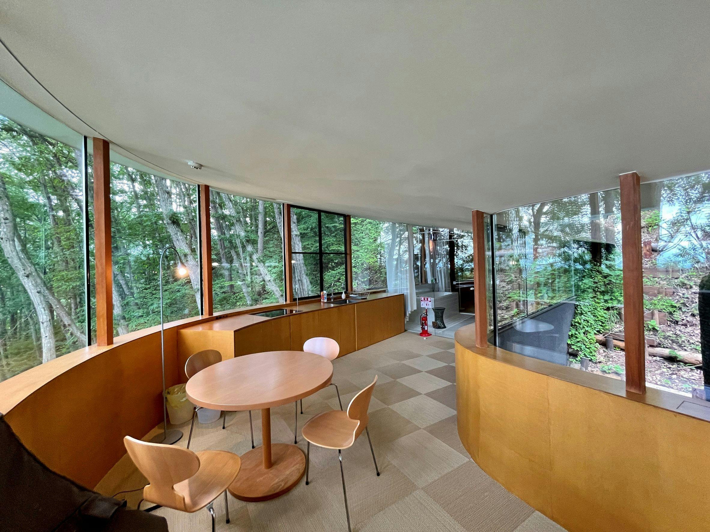 原始的な自然が残る別荘地内に、崖に差し込まれるように建てられた回廊型の建物。展望台のように森に浮かんだリビングと、洞窟のように大地に抱かれたベッドルーム。建物に居ながらにして森と一体となる宿泊体験を。