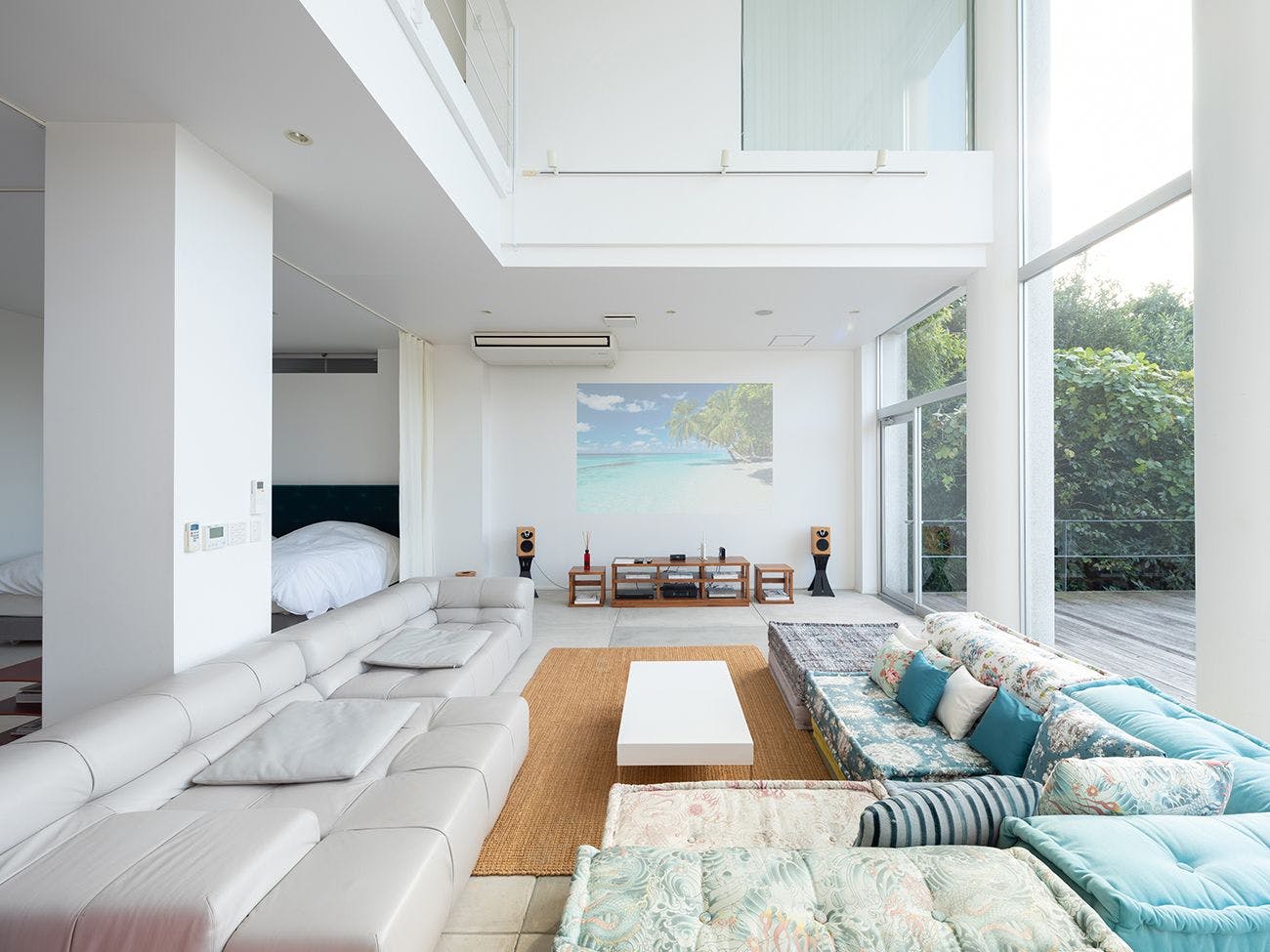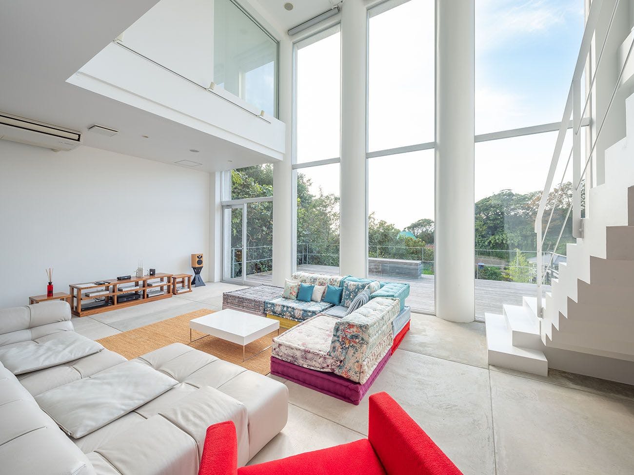 海を見下ろす高台に立ち、天井高6mの吹き抜け空間により、海と空の両方を堪能できる3階建てのデザイナーズハウスです。
