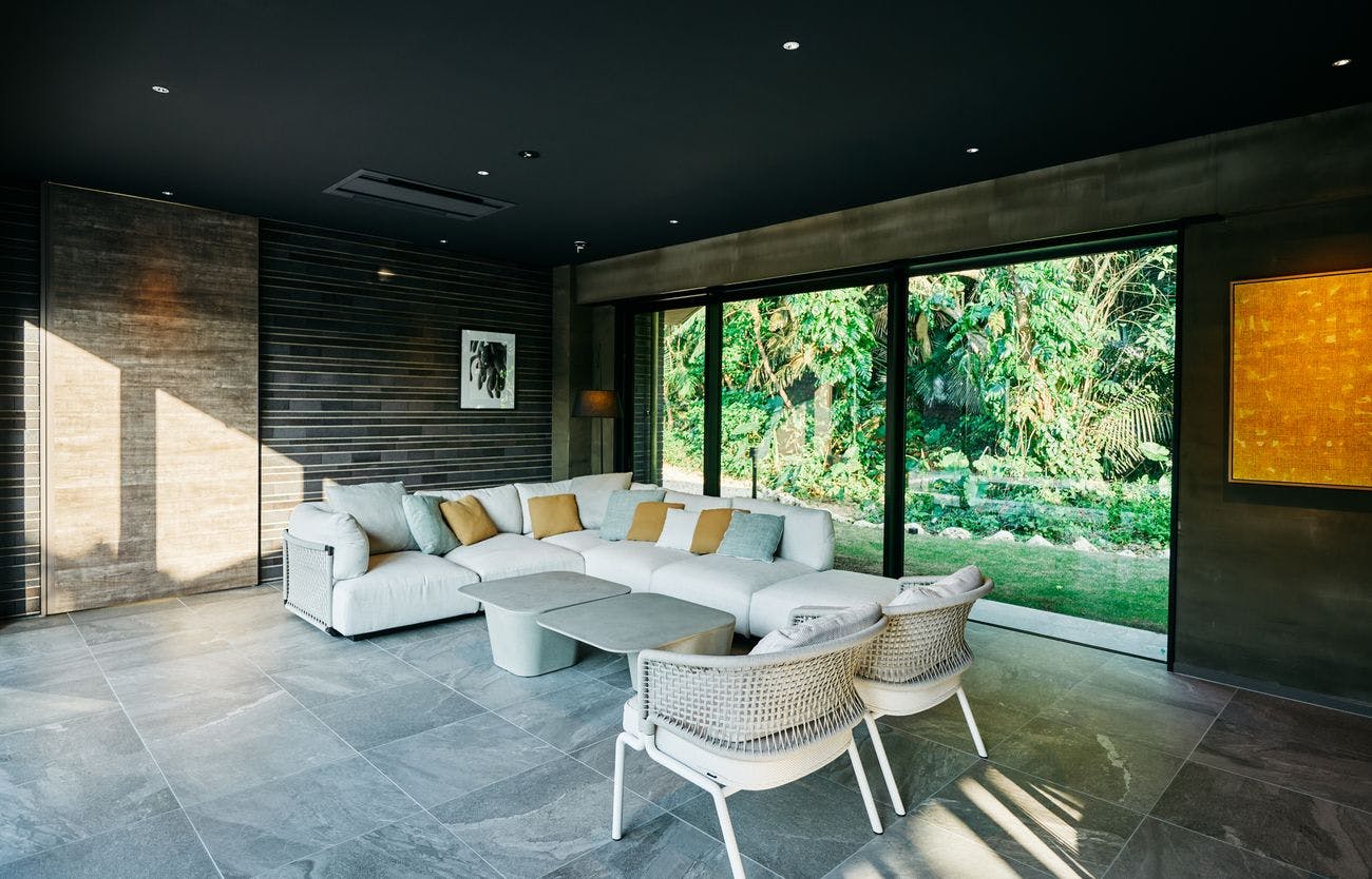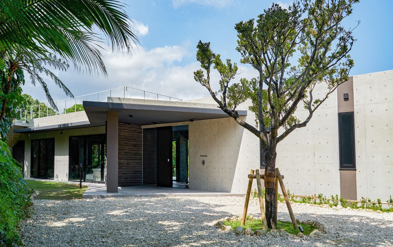 石垣島のエナジーを存分に吸い上げた樹々の中に、静かに佇むヴィラ。敷地面積1,698平方米の広大な土地を活かした贅沢でモダンな造りの建物です。