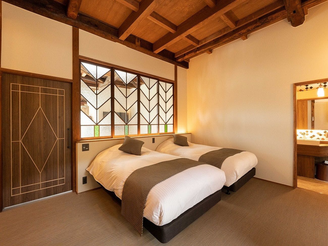 川原町本通りから一本裏、宿いとう敷地東に建つ「鶯(うぐいす)」。かつてのいとう旅館から一新、モダンな貸切宿にリノベーション致しました。春を告げる鶯の色をイメージした壁色と曲線がテーマの鶯。照明の飾りやステンドグラス、バスルームのデザインに至るまで柔らかな印象を演出しています。随所に残る面影の味わいとともに、長良川畔でのプライべートなくつろぎを。
