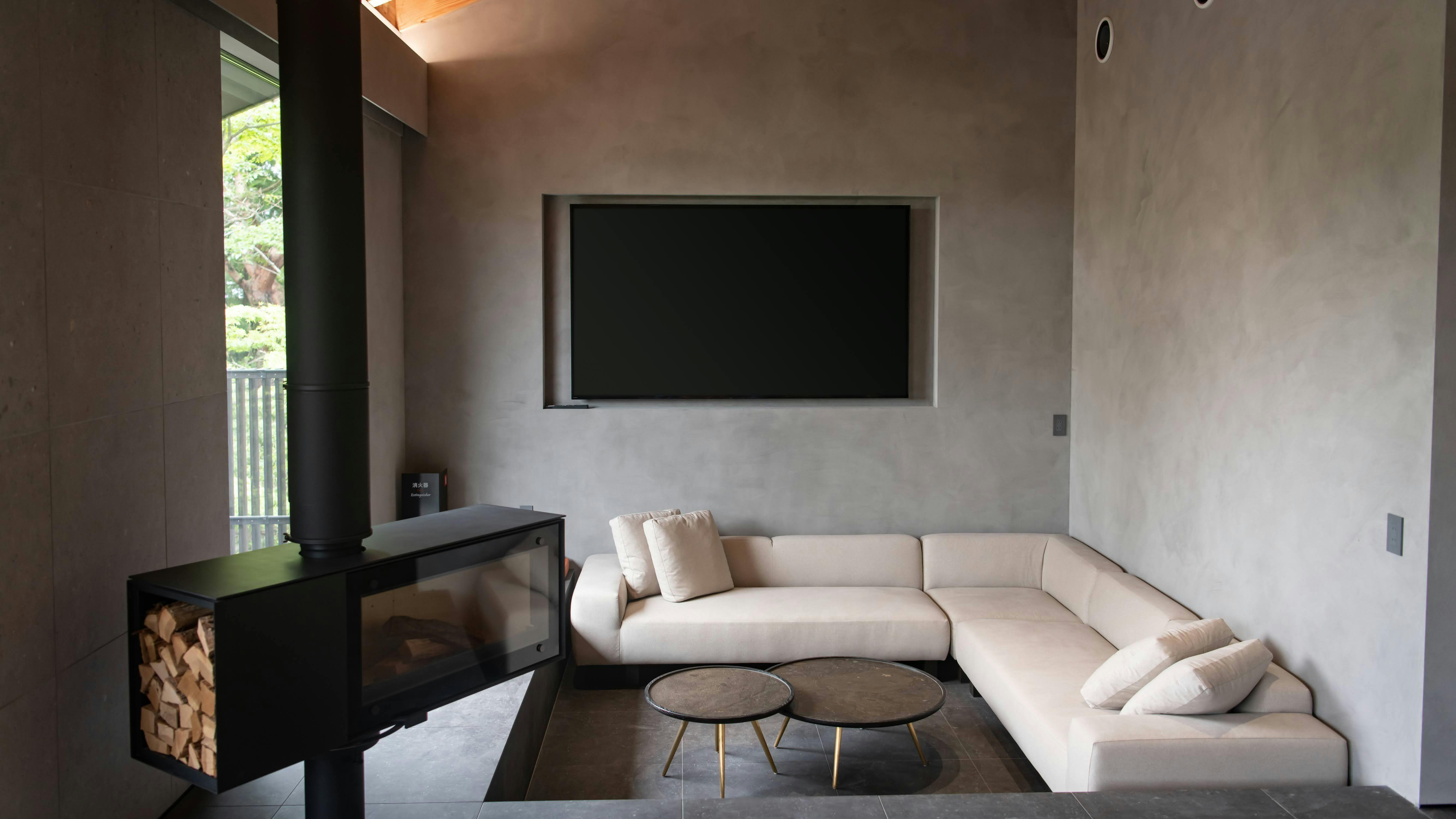 冬には世界最高峰の薪ストーブブランドのスキャンサームの薪ストーブが炎の揺らぎや色合い、薪の燃える音で心地よい雰囲気を演出します。