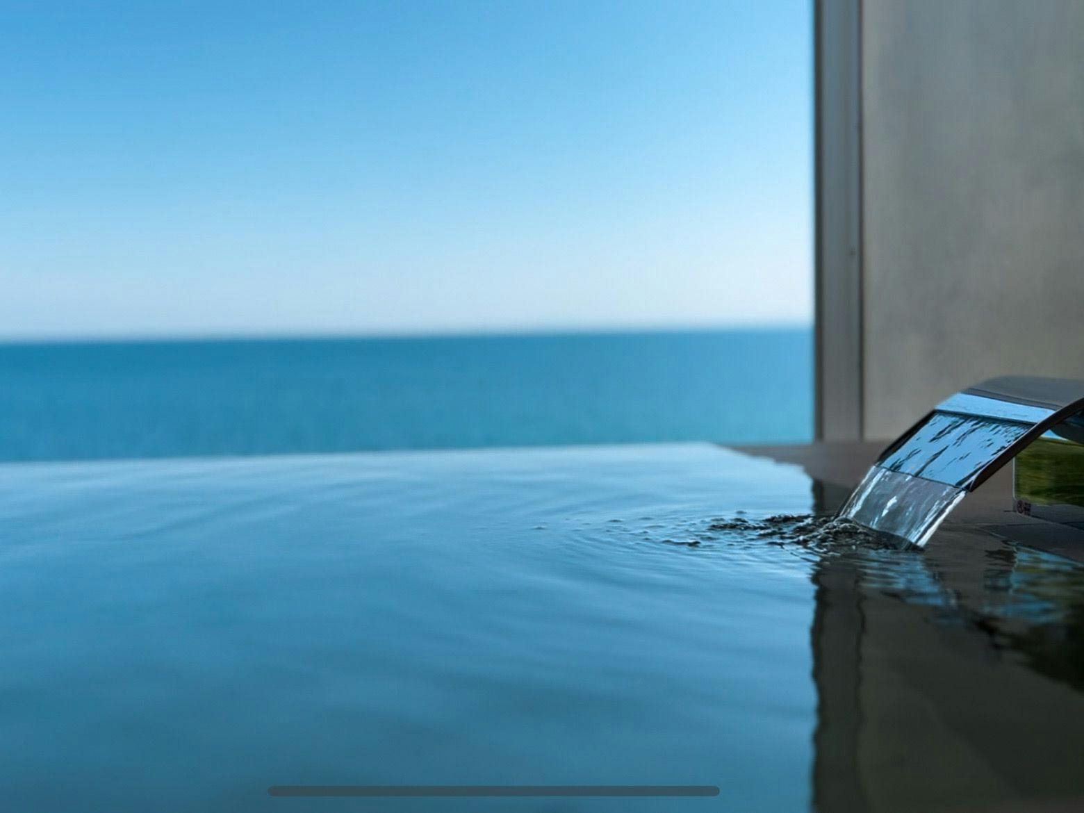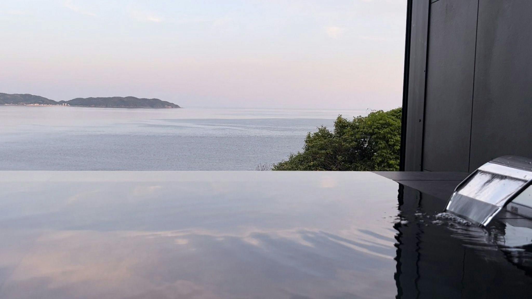 お風呂は海との一体感を意識した半露天インフィニティ風呂。日頃の喧騒を忘れて入るのが オススメ