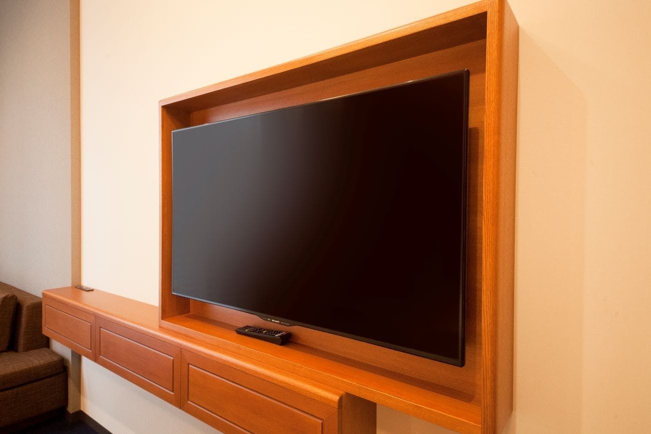 足をのばしてお寛ぎいただけるソファー、もしくは一人掛けソファー、丸テーブル、50型の大型テレビを備えています。
