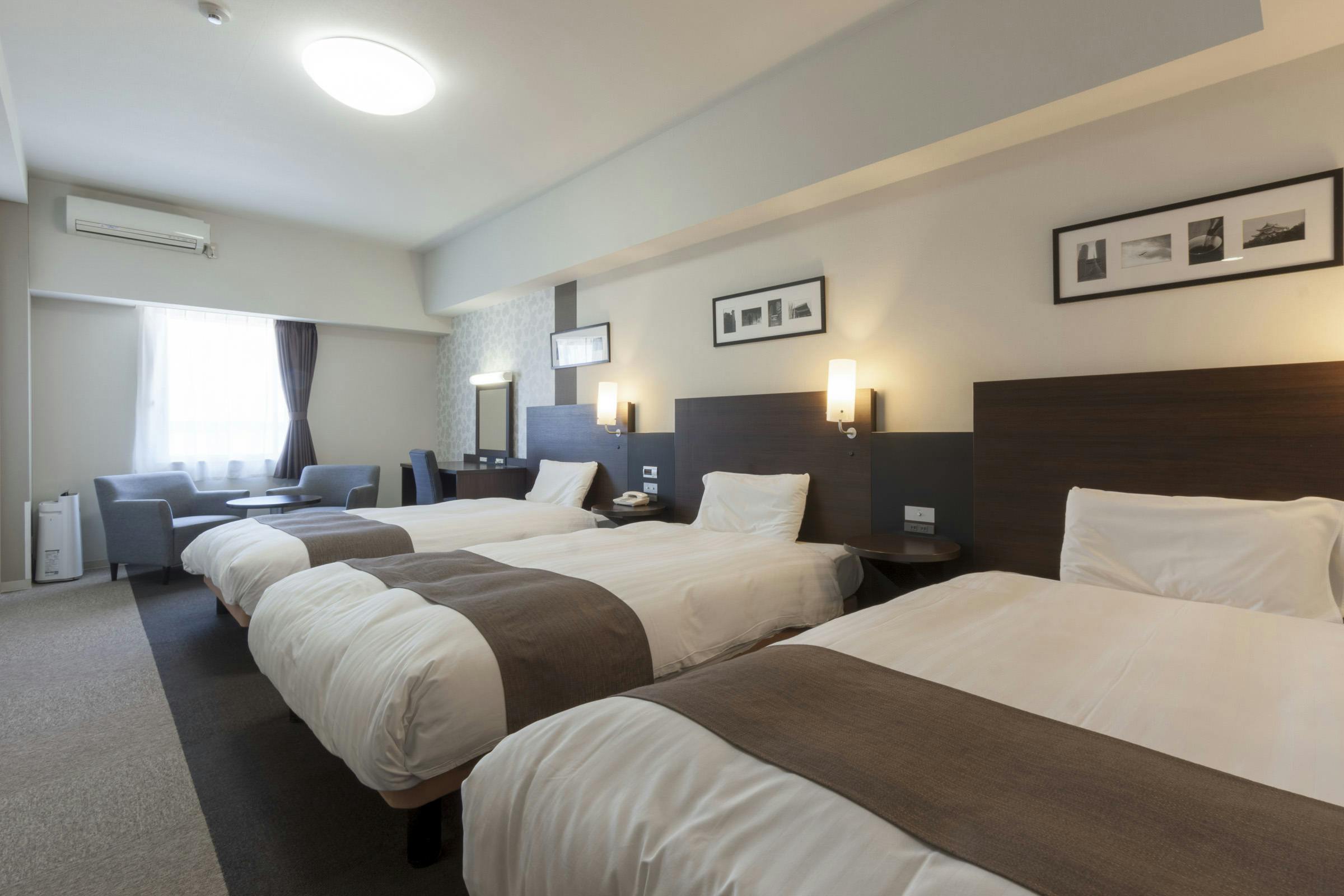 広さ36平米、ベッド幅123cm×3台サラダ・フルーツのある朝食サービス一杯毎に豆を挽く本格派ウェルカムコーヒー小学生以下のお子様添い寝無料インターネット環境は有線LAN&Wi-Fi無料接続が可能!