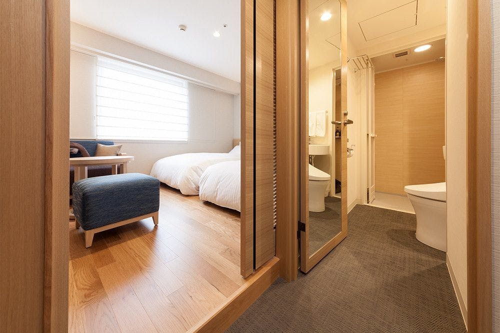 女性専用フロアのツインルーム。カーペット床で段差がないつくりです。【室内備品】フットマッサージャー・ネックマッサージャー【バスルームタイプ】シャワーブース(バスタブなし)