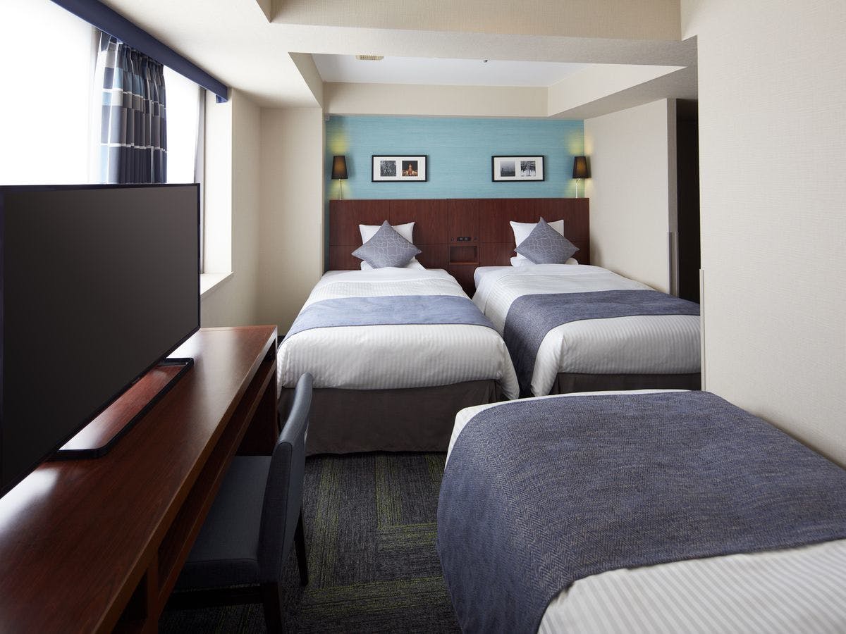 ■広さ:19~23平米 ■ベッド:110cm幅×2台○ WiFi、共にご利用無料○ 加湿機能付き空気清浄機○ 低反発とスモールフェザー、2つの枕を用意