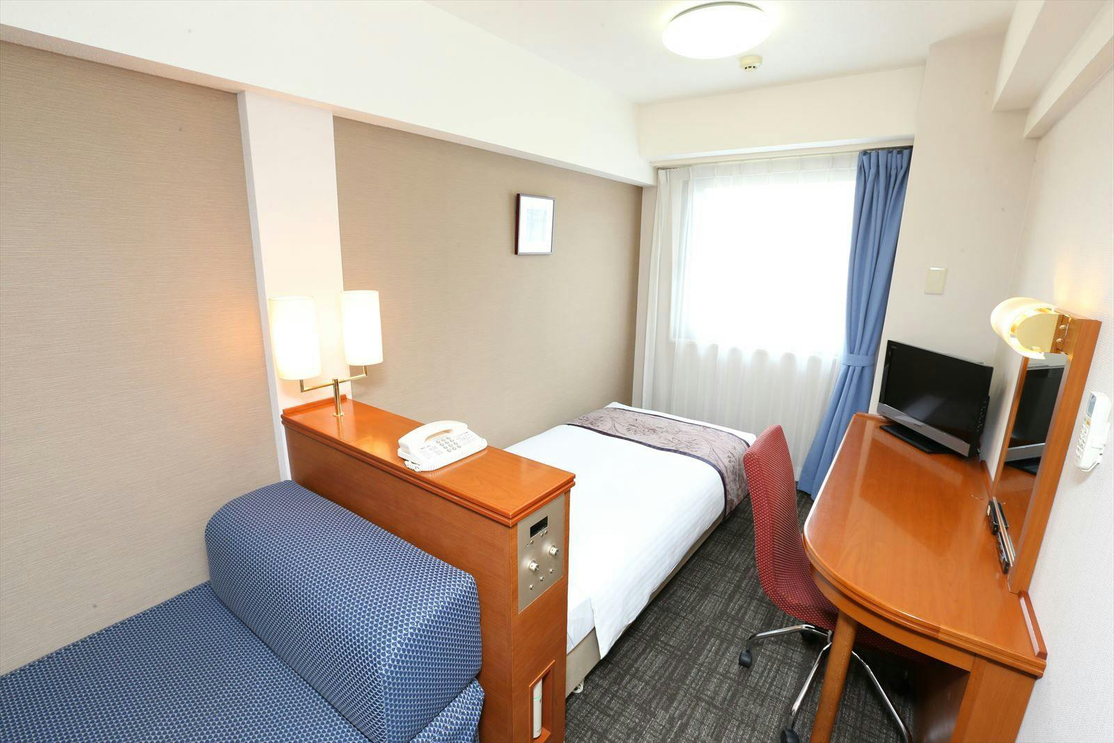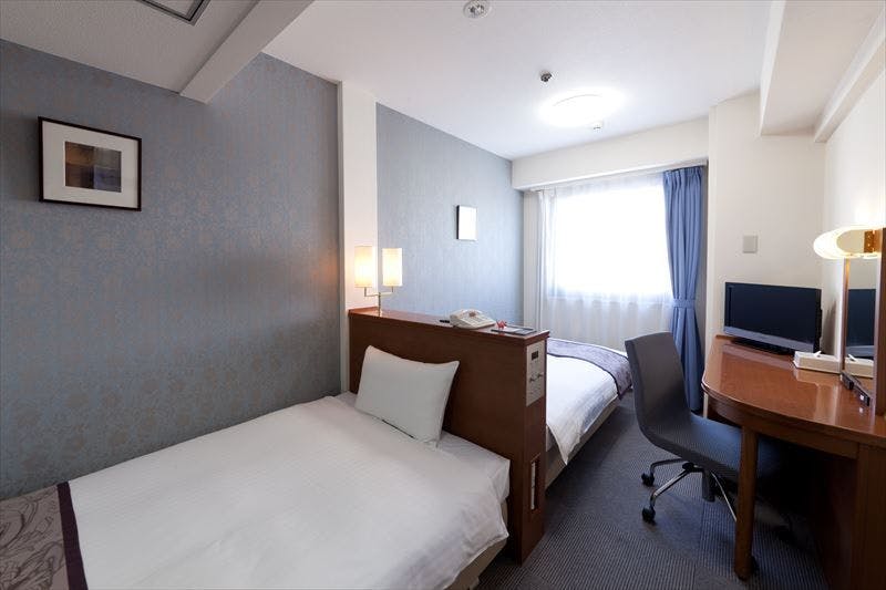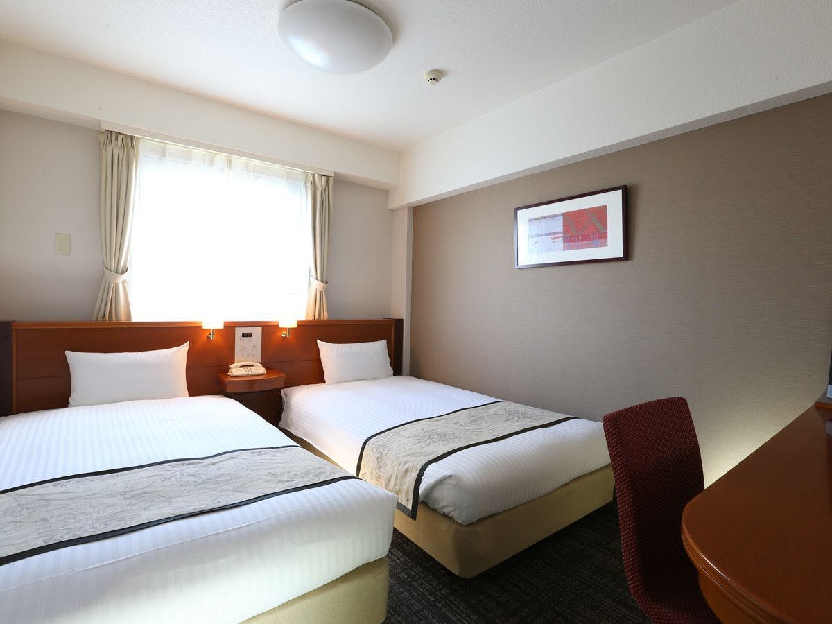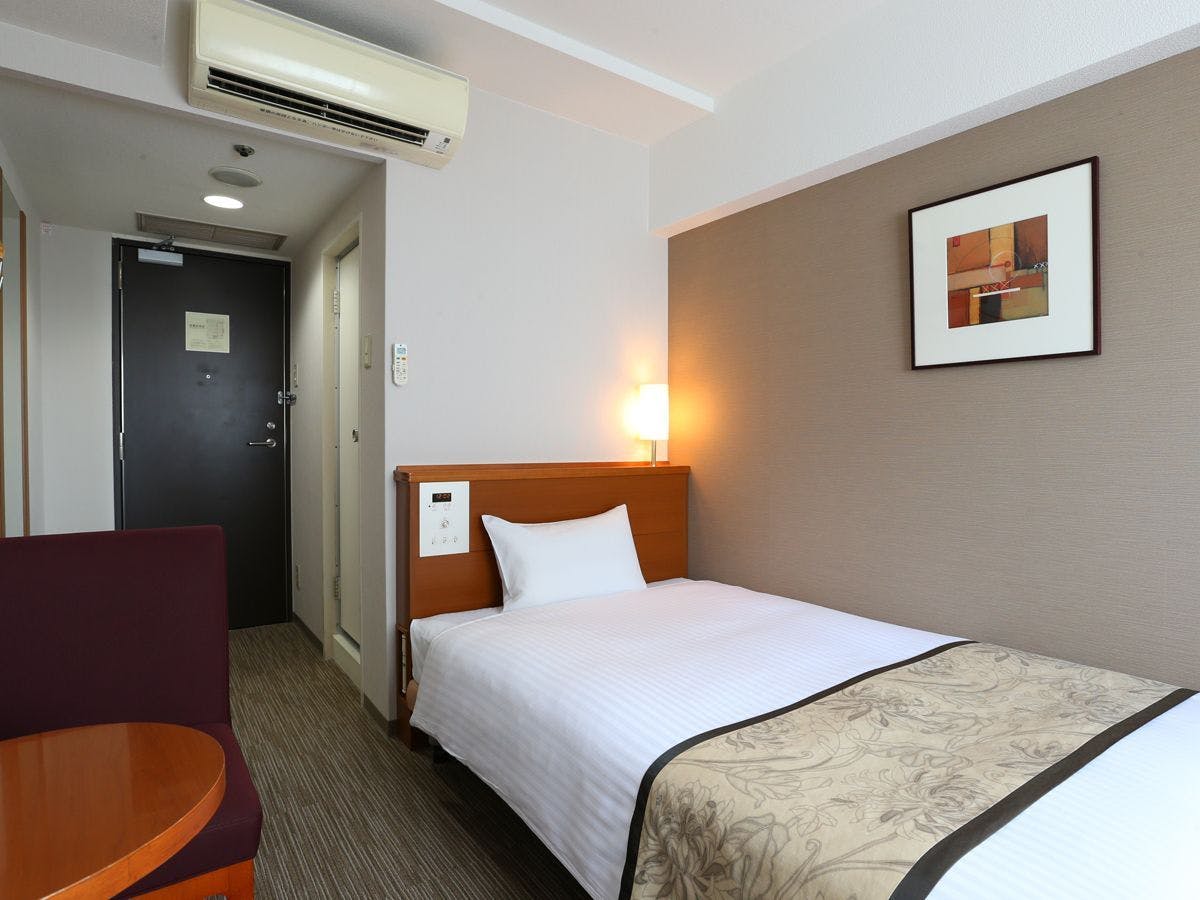 機能的にコンパクトにまとまったお部屋です。品も充実!カップルやご夫婦でのご宿泊に最適す。デュペスタイル寝具、シャワー付トイレ、個別空調、WiFi(LAN接続無料)、冷蔵庫、明るいシーリングライト、マイナスイオンドライヤー、電気ポット、アメニティー各種をご準備しております。館内の大浴場、OAコーナー、ランドリーコーナーはどなたでもご自由にご利用頂けます。