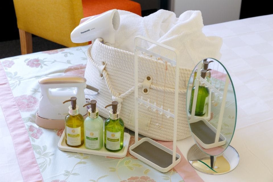 お茶セット/コーヒーセット/スリッパ/バスタオル/フェイスタオル/ボディソープ/フェイシャル&ハンドソープ/シャンプー/コンディショナー/歯磨きセット/カミソリ/シャワーキャップ/ヘアブラシ/ボディタオル/綿棒/ナイトウェア/消臭スプレー