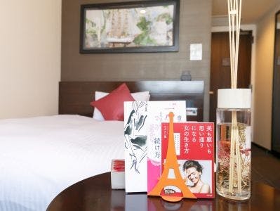 ミネラルウォーターとカップコーヒーセットの無料サービス、スリッパは清潔感や肌触りを重視したお客様専用の使い捨てタイプをご用意させて頂きました。インターネットは高速有線LAN回線を無料でご利用頂けます。地上デジタル放送対応の薄型液晶テレビ、VODシステム(有料)、無線(Wi-Fi)も完備しています。小物やアメニティも女性の為だけに用意したもので充実!