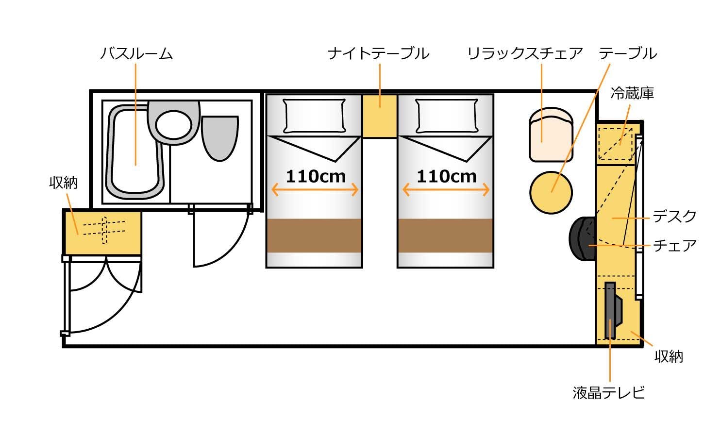 110cm幅のベッドを2台配置したベーシックなタイプのツインルームです。
