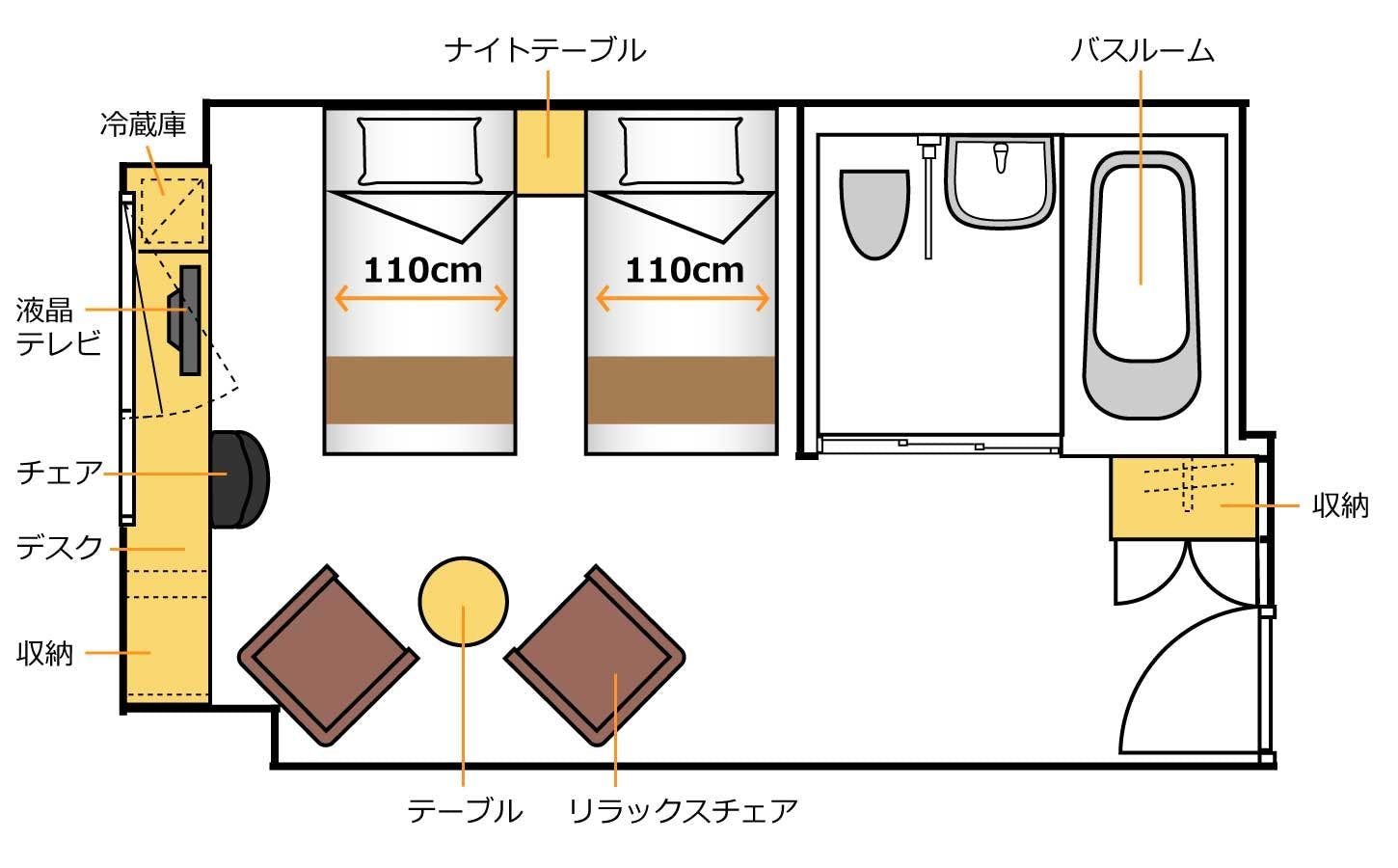 110cm幅2台のベッドを繋げて配置したお部屋です。(2台合わせて220cm幅・大きなダブルベッドの様にご利用いただけます。掛布団は別々)ベッドマットを1枚にしてありますので、ベッドの境目も気になりません。当ホテルの中で最も部屋が広く、お風呂とトイレが別々なのも大きな魅力です。空気清浄機やフットマッサージャー等、デラックスルーム専用の特別な装備やリネンを備えており、より贅沢な雰囲気が味わえます。エキストラベッド利用で大人3名様でのご宿泊が可能です。(エキストラベッドのシーツ等は、通常部屋と同等のものになります。)