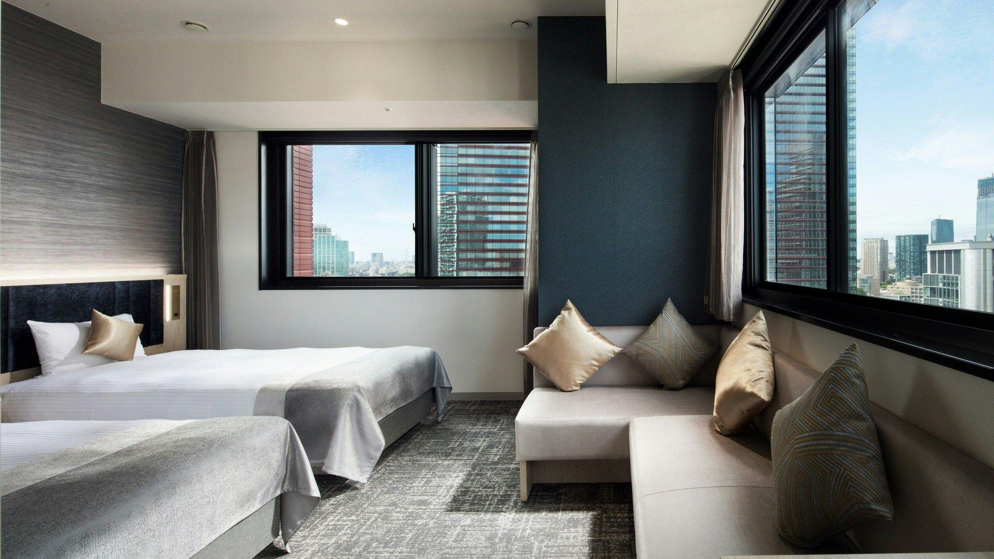 全室高層階、19平米以上のシティビューが臨めるお部屋で快適なひとときを。心安らぐ緑を取り入れたロビーにはソファとカウンターテーブルを設置しました。ビジネスにもご歓談にも、多目的にご利用いただけます。