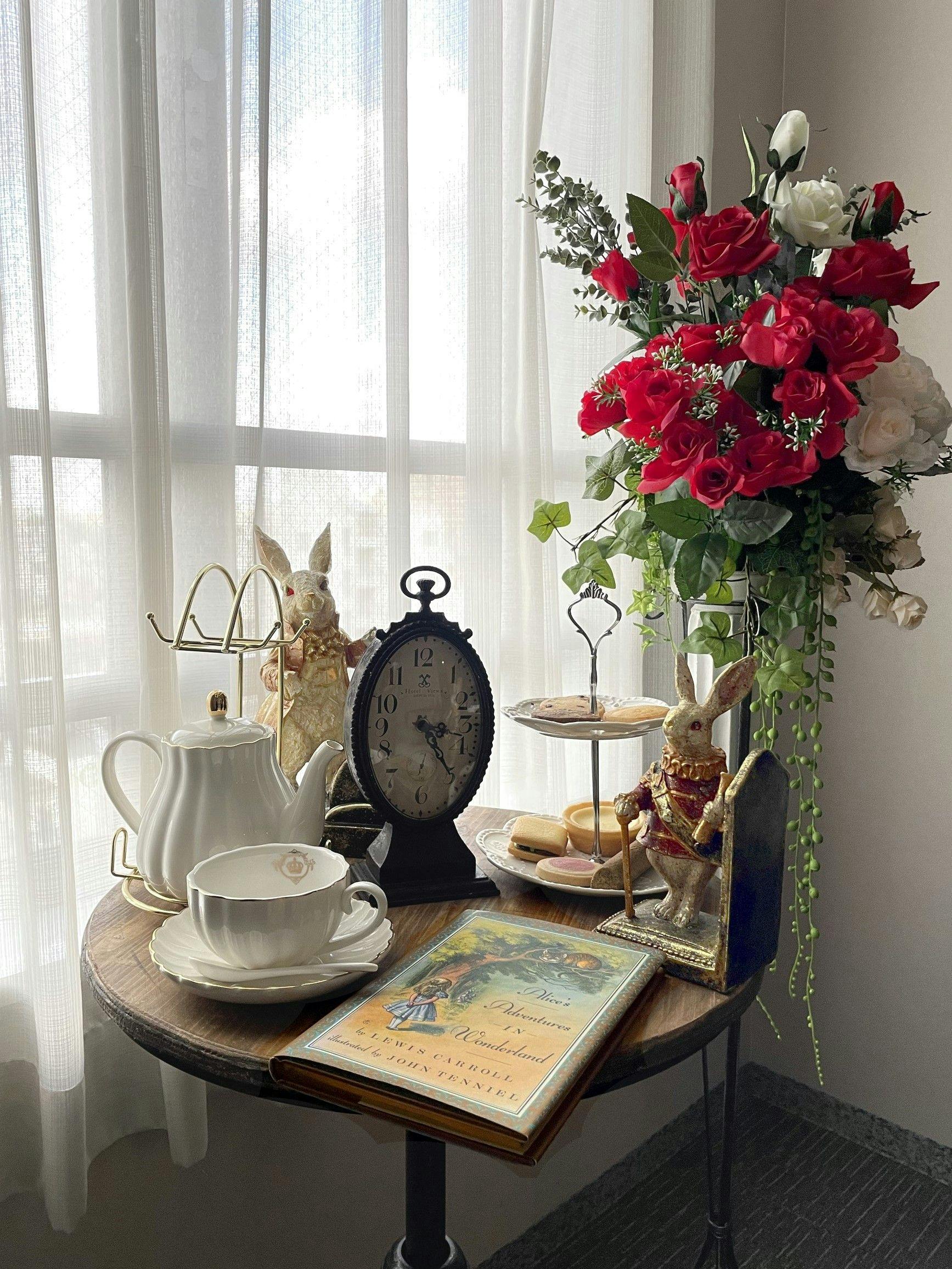 イギリスの絵本、不思議の国のアリスの世界をお過ごし頂けるお部屋でございます。 この部屋にはコーヒーテーブルがございます。マッサージチェアはございません。