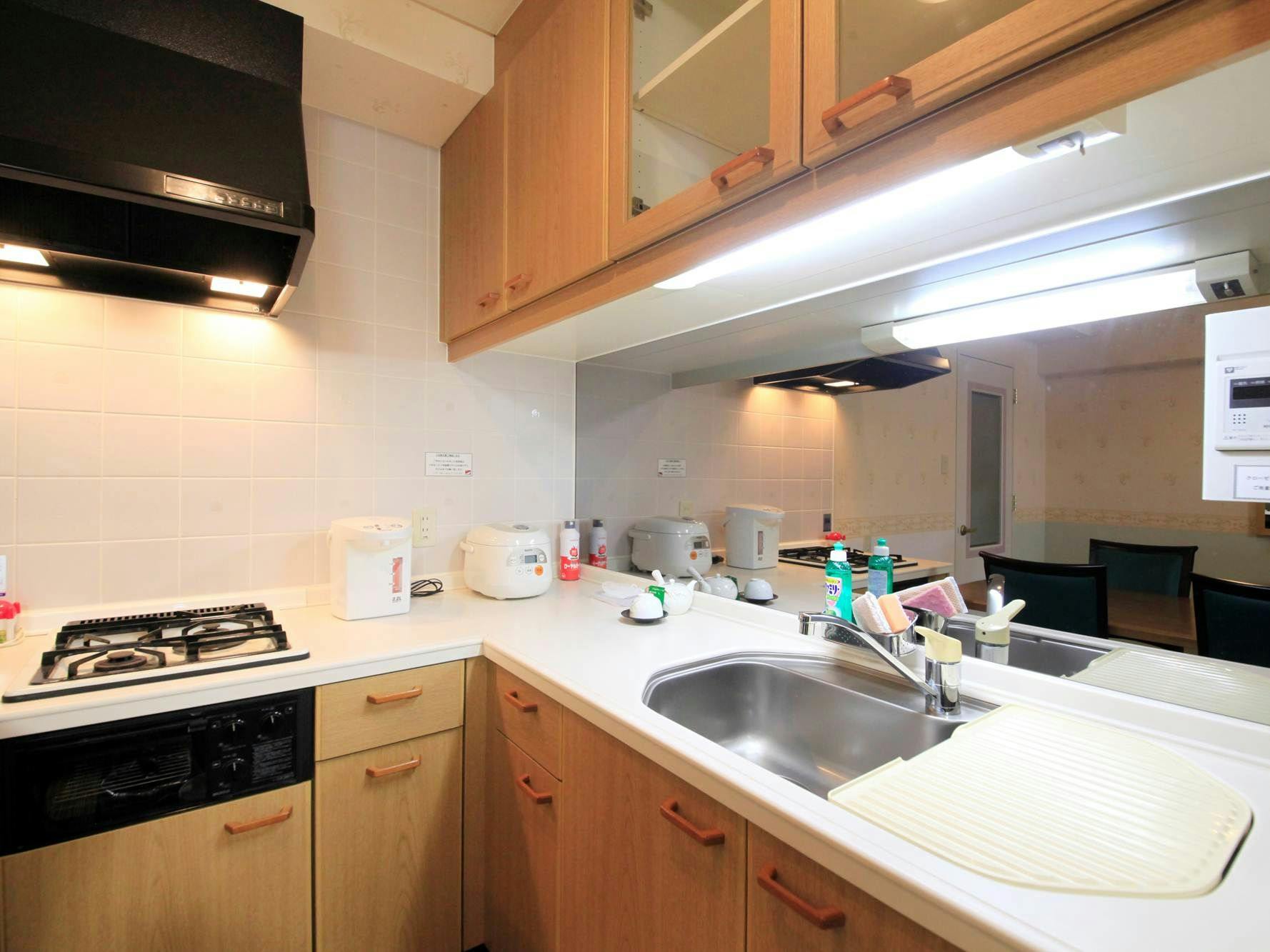 キッチンがついており、一般的な調理器具、食器を備え付けております。