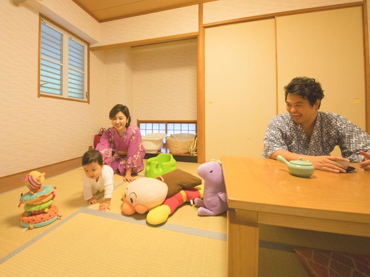 60平米和洋室(最大定員6名)。靴を脱いであがるので、はいはいをする赤ちゃんも安心。