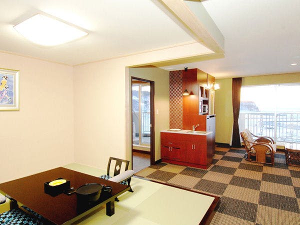 広々とした和洋室タイプの特別室でございます。オホーツク海が一望できる客室露天風呂(TV付)が魅力。アメニティもバスローブ・特別室専用簡易スリッパなど充実しております。洗濯機もお部屋に完備!長期滞在にもお勧めです(洗剤はフロントにて販売)・インターネット接続無料(Wi-Fi)・全室バルコニー付※3名様以上でご利用の場合は、和室にお布団をご用意させていただきます。