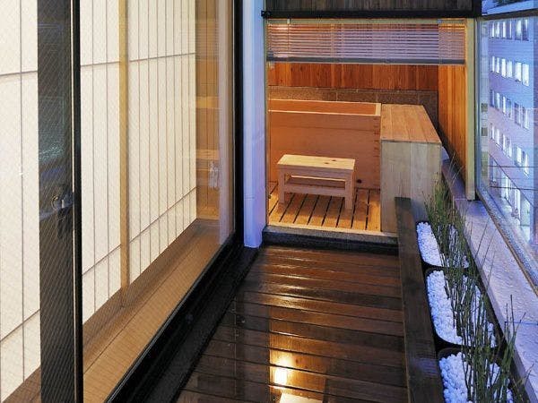 都心に露天風呂付客室登場。空を見ながら入浴できます。トイレ(ウォシュレット)付。簡単な和朝食が無料サービス。27型液晶テレビ、有線LANによるインターネット接続無料。WI-FI全館対応!
