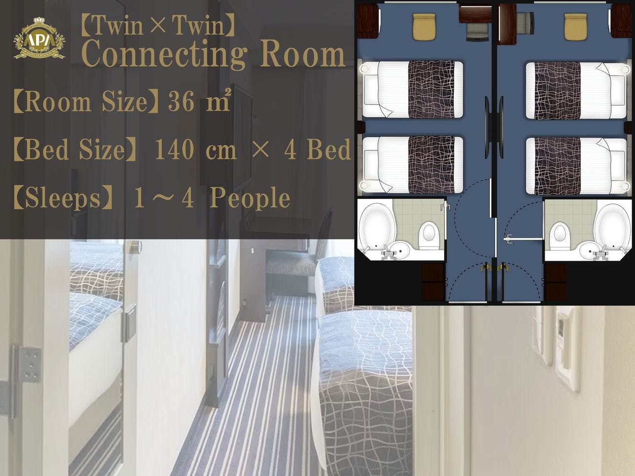 ・広さ18平米×2室/ベッド幅110cm×2台×2部屋分ツインルームを2部屋分繋げたお部屋です。・40型液晶テレビ完備・Wi-Fi無料接続・インターネット有線LAN無料接続・快眠を追求したアパホテルオリジナルベッド「Cloud fit(クラウドフィット)」を導入・まくらとベッドとの相性を、科学的に検証を行い開発したアパホテルオリジナル「3Dメッシュまくら」・ふんわりやわらか高級羽毛布団(デュベ)・温水洗浄便座完備・全客室無料コーヒーメーカー(ドルチェグスト)導入