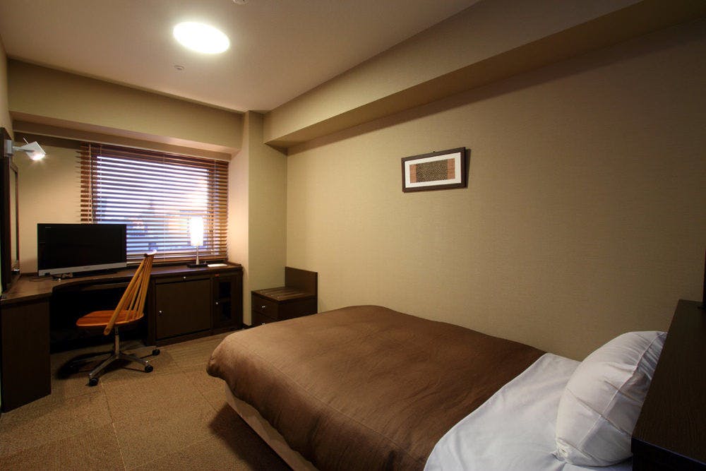 ●落ち着いた色調でゆったりお寛ぎいただけるお部屋●ベッド幅140cmのダブルベッドを設置●インターネット接続無料(LAN対応・Wi-Fi対応)●温水洗浄トイレ・ズボンプレッサー完備●歯ブラシ、ヘアブラシ、カミソリ、綿棒などは1階ロビー内フリーアメニティコーナーに設置