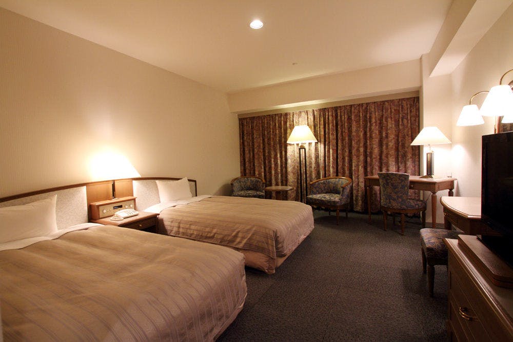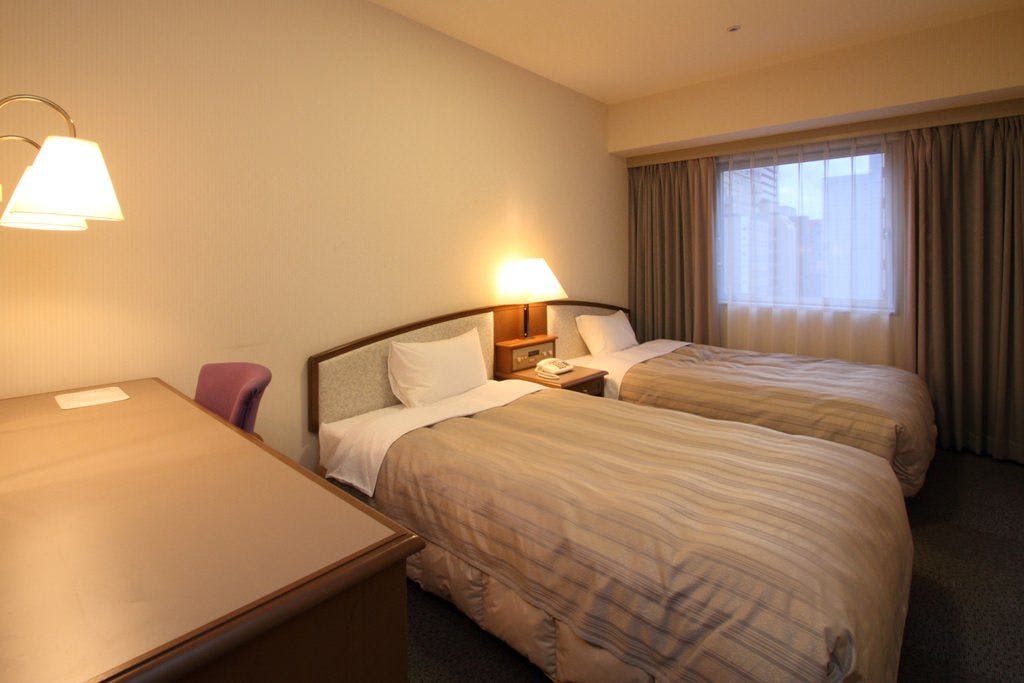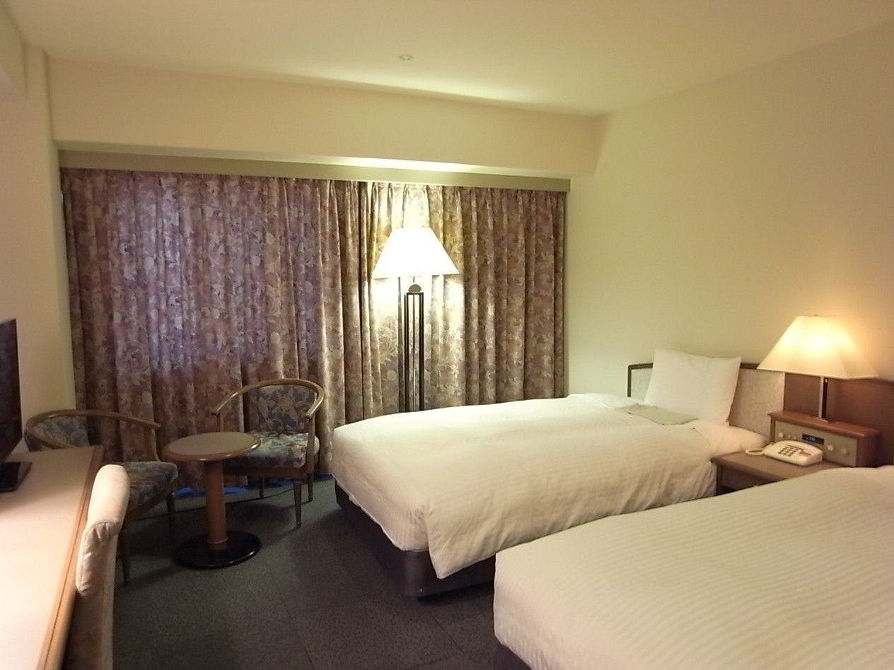 ●2台のベッドを並べたハリウッドタイプのツインルーム●各フロアの角部屋●インターネット接続無料(LAN対応・Wi-Fi対応)●温水洗浄トイレ・ズボンプレッサー完備●歯ブラシ、ヘアブラシ、カミソリ、綿棒などは1階ロビー内フリーアメニティコーナーに設置