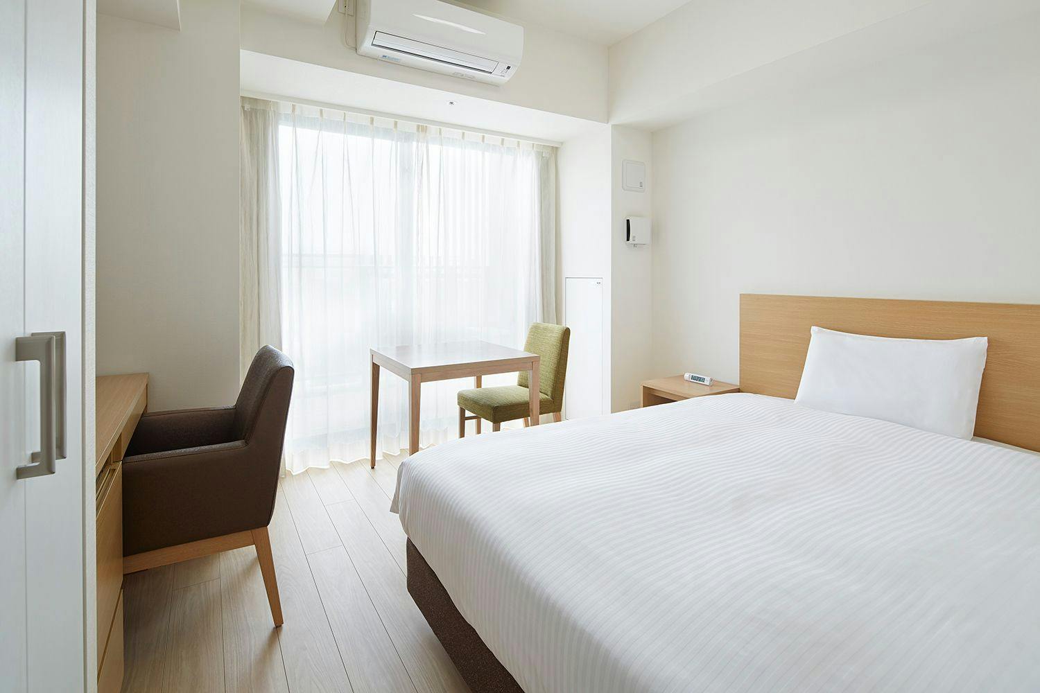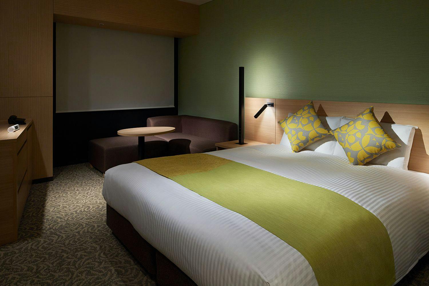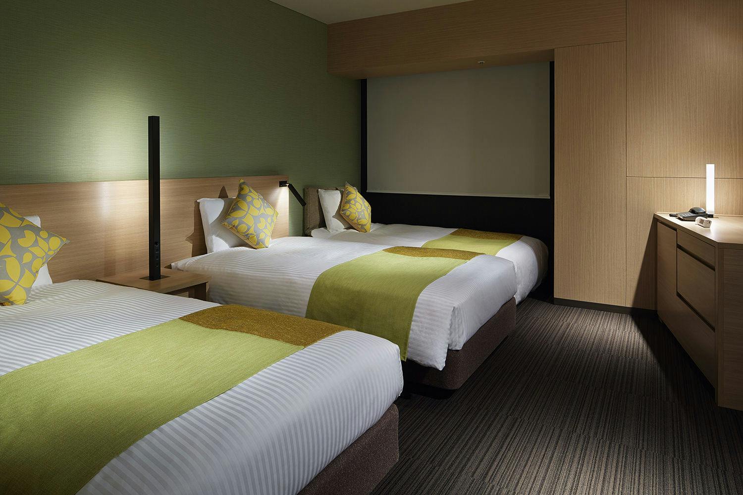 緑と木目を基調とした落ち着いた雰囲気のツインルームです。120cm幅ベッドが2台入った機能的な客室はカップル・ご夫婦でのご利用に最適です。