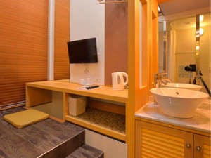 7.75平米。シャワールーム(バスタブなし)・テレビ2台設置。ベッドは階段を上がる高床式タイプ。全室バルコニー付