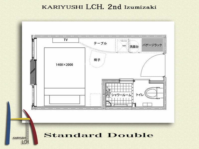 ベッドは高床式ベッド採用、角部屋のため、バルコニー出入り口とテーブル側に小さな窓があるお部屋になります。