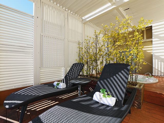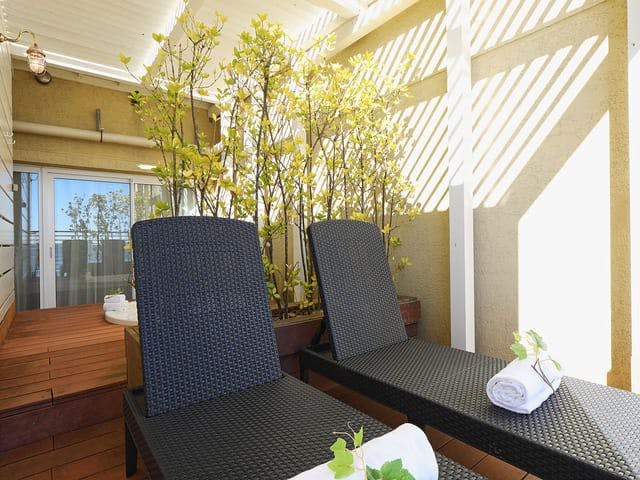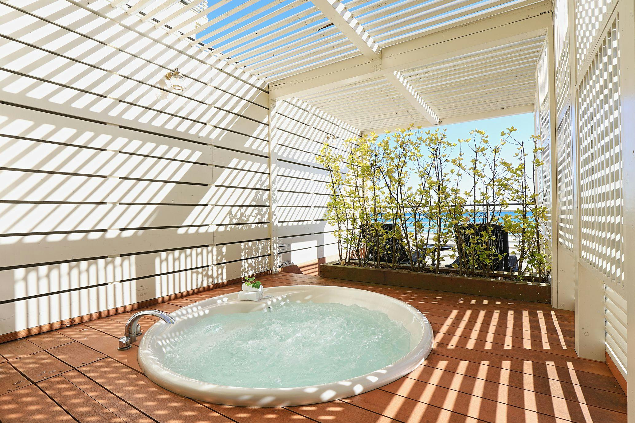 51平米の広々とした空間、バルコニーに設置された「ジャグジーバス」付きお風呂。最高級のステイをお楽しみ下さい。※ジャグジーご入浴時は水着必須となります。ご準備下さい。睡眠中のあらゆる動きに細かく的確に対応し、自然で快適な寝姿勢を保つ「Symonds(シモンズ)」社製のマットレスを導入。