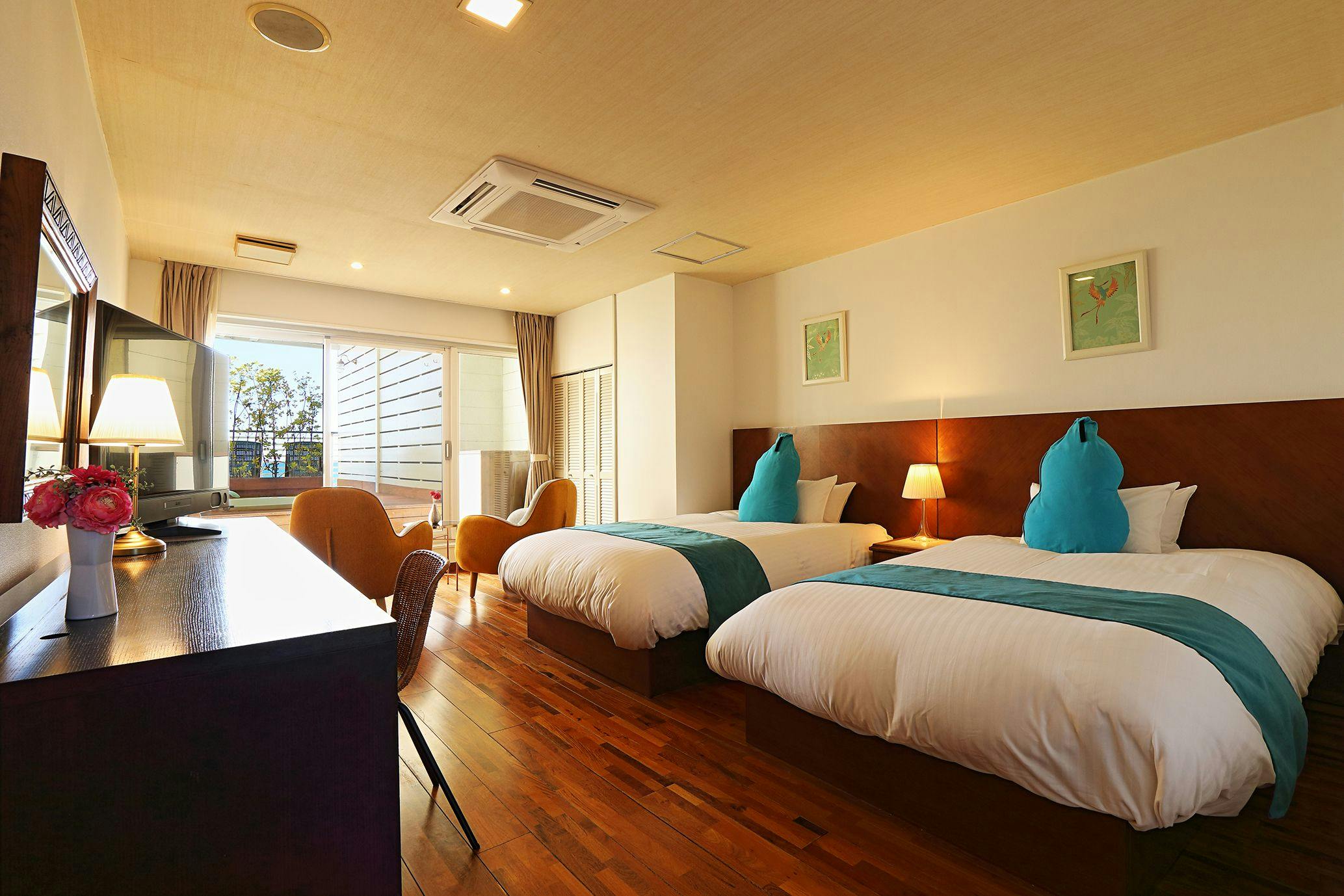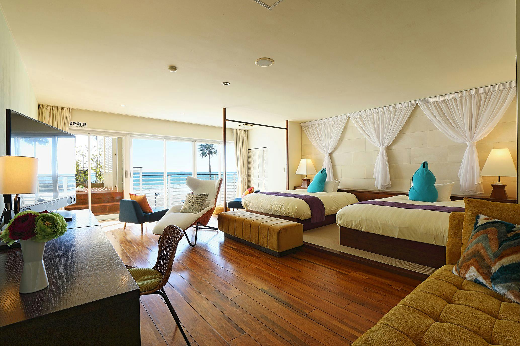 アジアンミックスのデザインテイストを取り入れたデラックスツインルーム。ゆったりとしたスペースで快適にお寛ぎ頂けます。 睡眠中のあらゆる動きに細かく的確に対応し、自然で快適な寝姿勢を保つ「Symonds(シモンズ)」社製のマットレスを導入。■全室オーシャンビュー■バス・トイレ独立タイプ