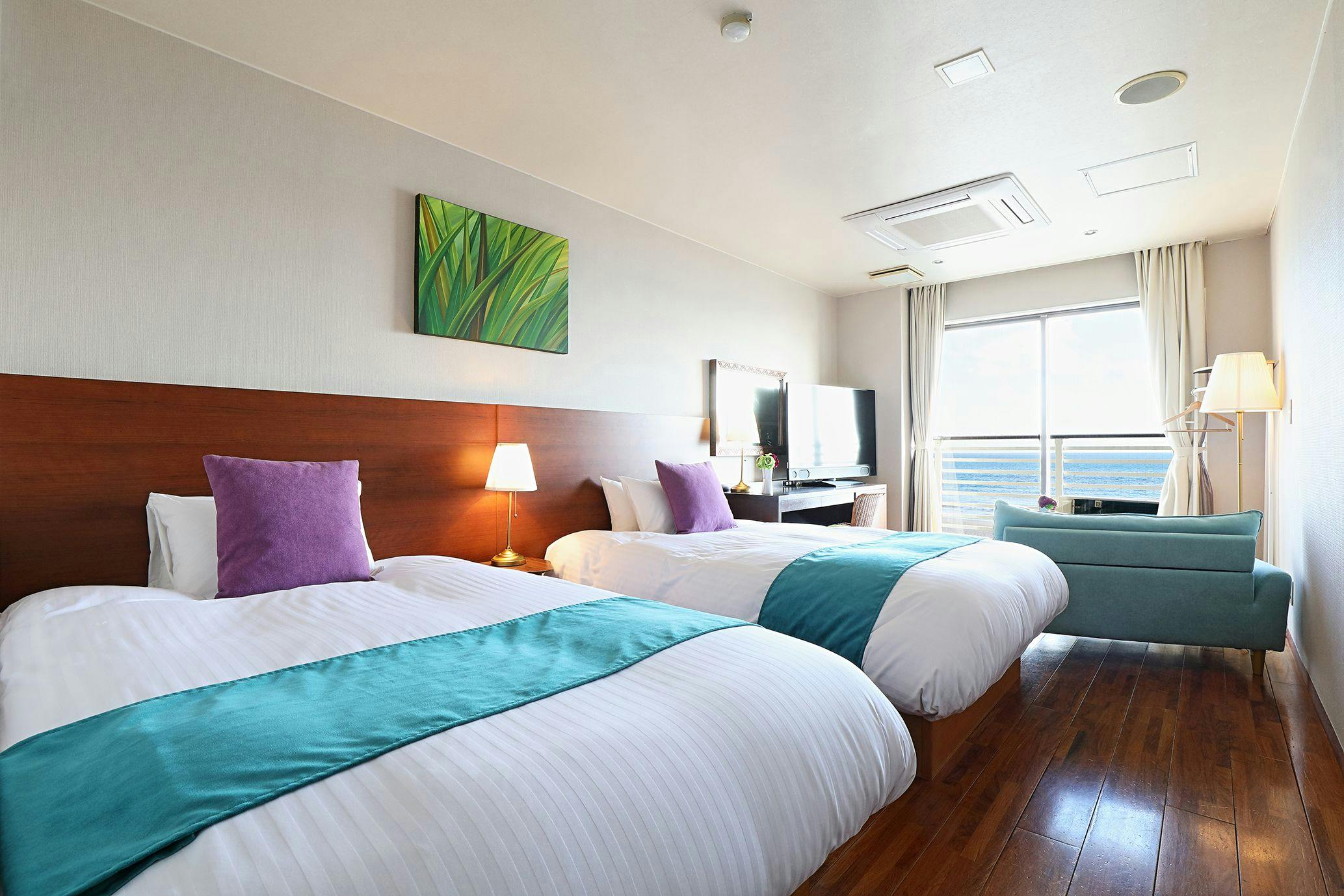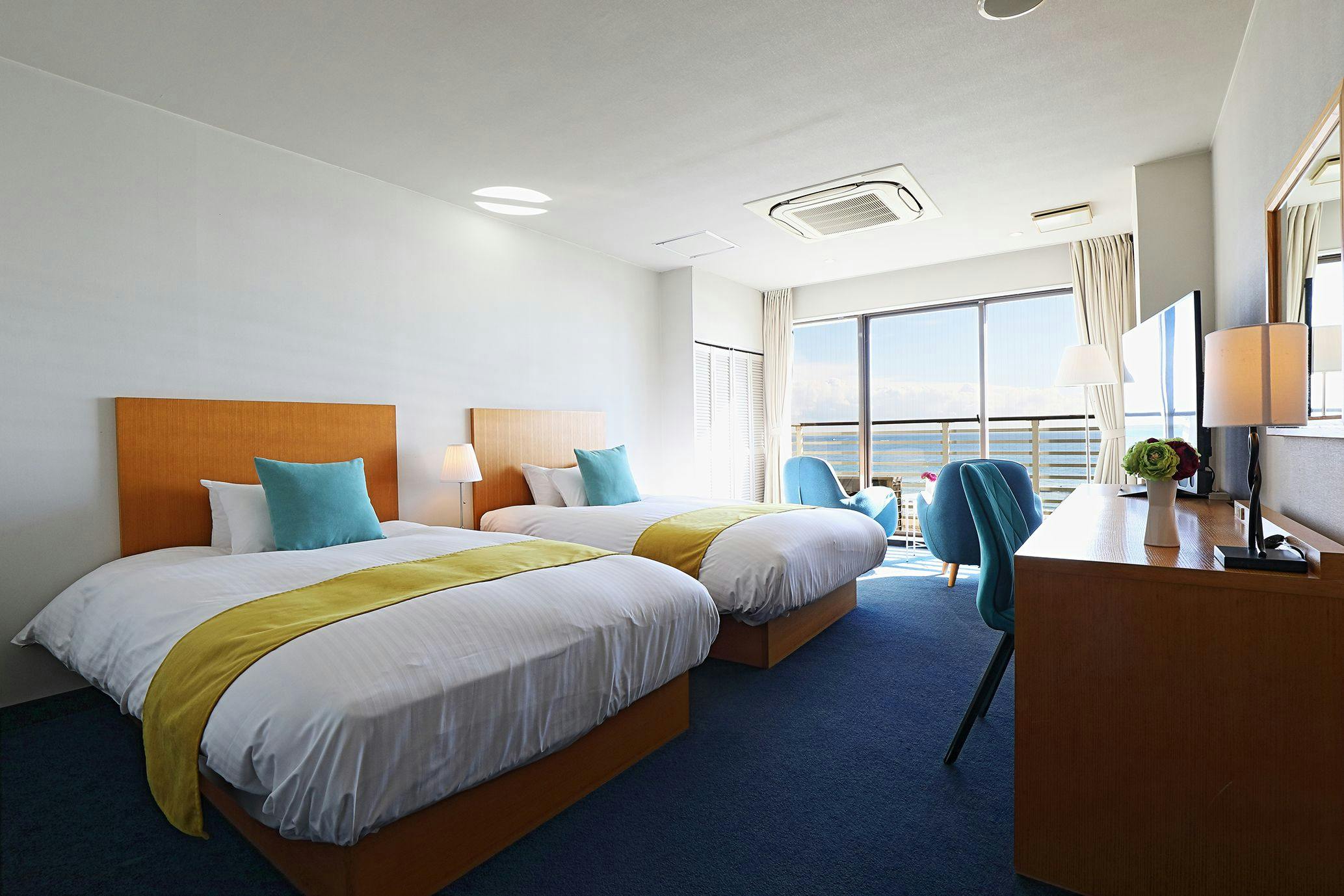 お二人での旅行に最適なスタンダードツインルームはアジアンミックスまたは西海岸をイメージしたデザインテイストのお部屋をご用意しております。 ■全室オーシャンビュー、海一望の抜群のロケーション。※タイプはパシフィック(床がフローリング)、アトランティック(床がじゅうたん)の2タイプ※選択不可