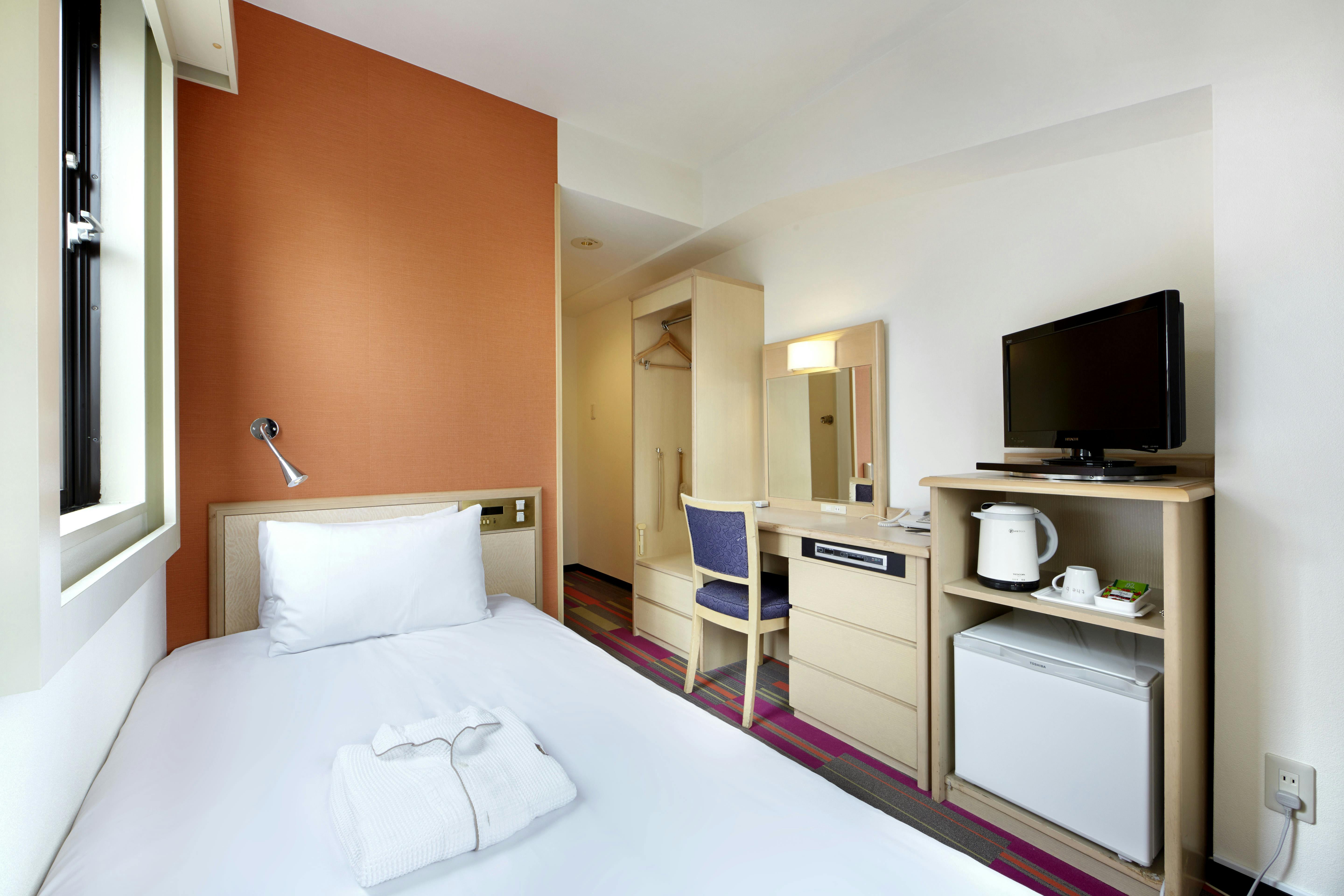 10平米のL字型のシングルルームです。リーズナブルにご利用いただける、コンパクトなお部屋です。面積:10平米、ベッド幅92cm×1台