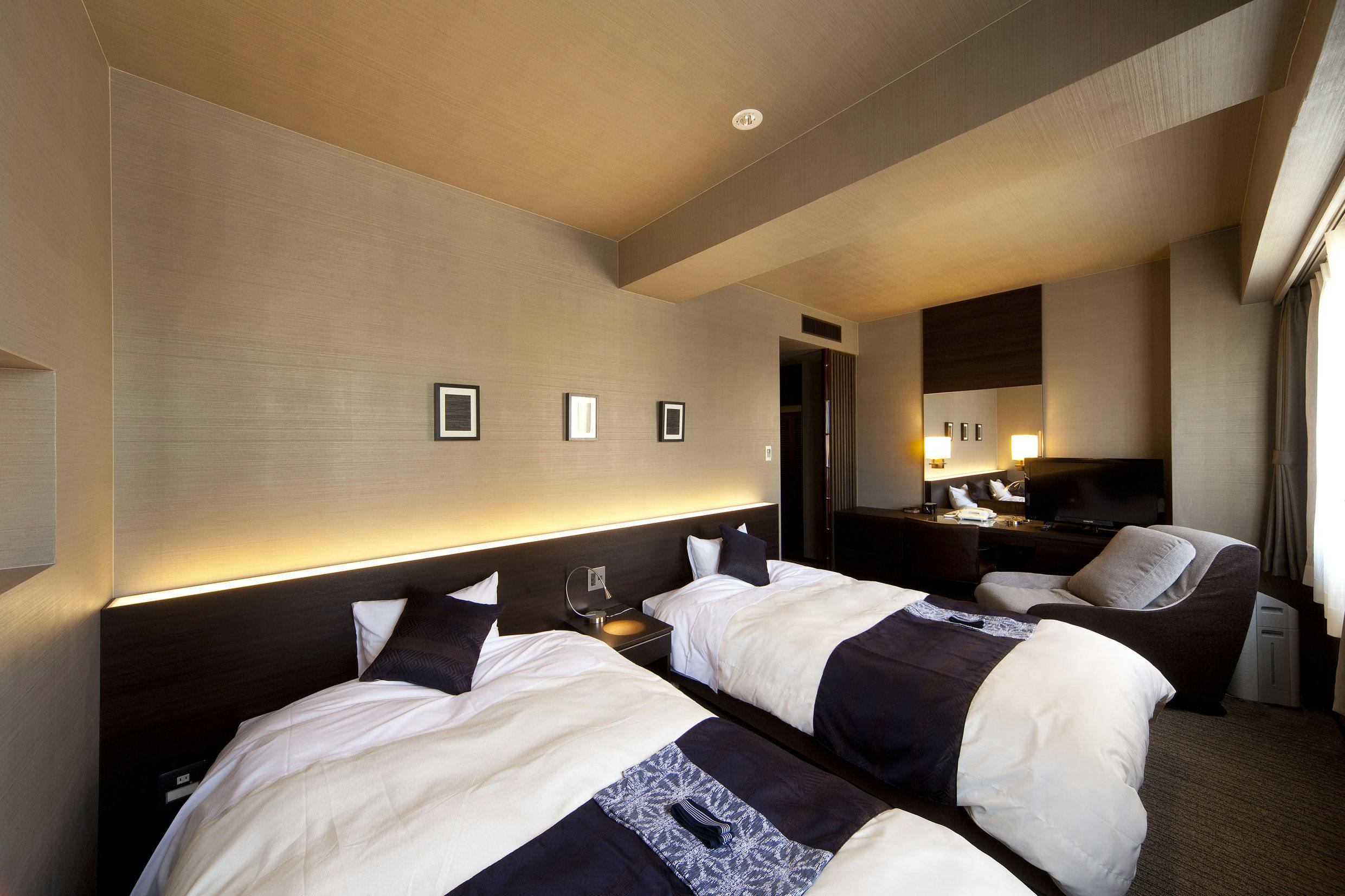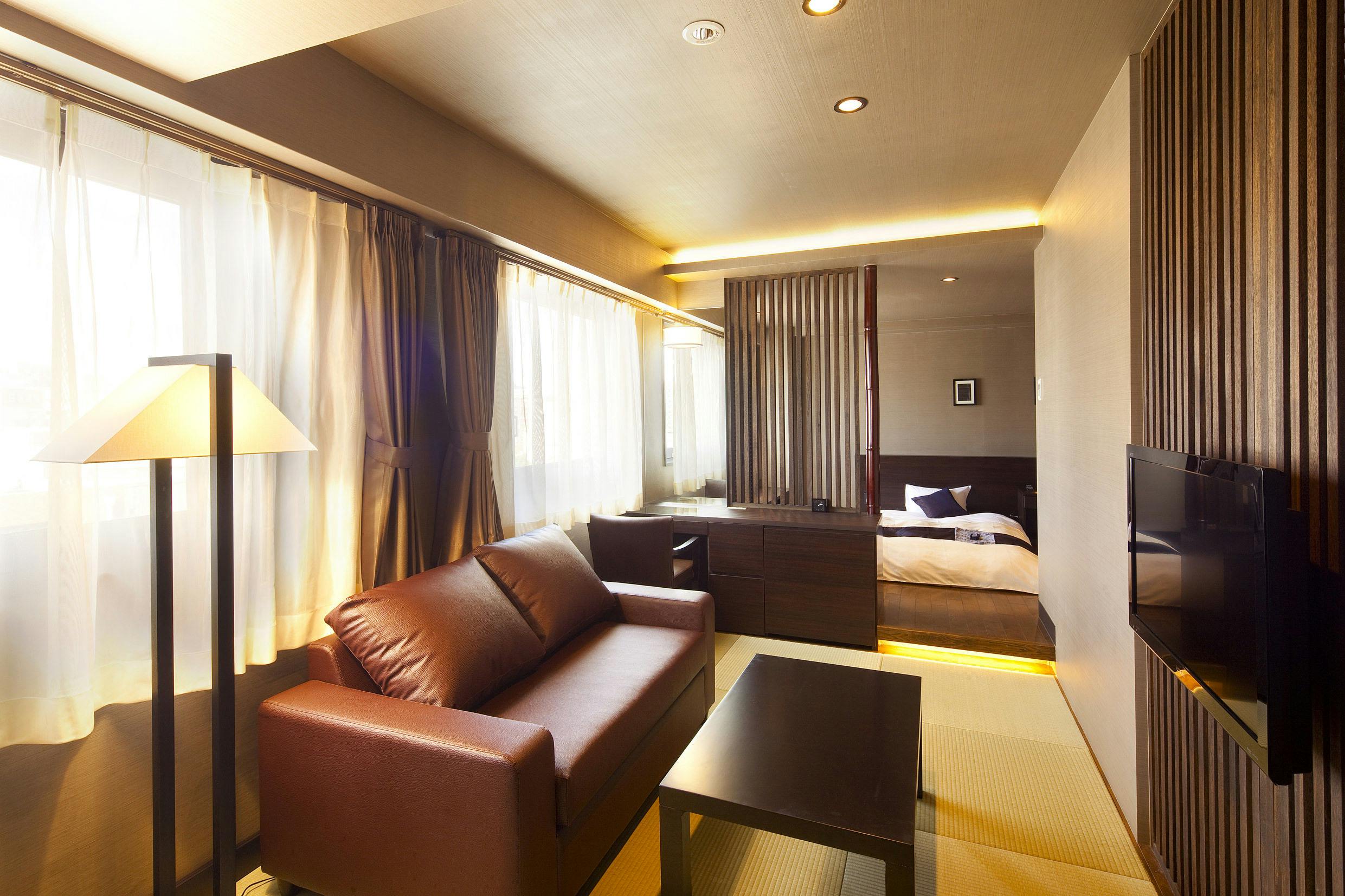 鹿児島のビジネスホテルでは珍しいリビングスペースに畳を配置したホテル客室。寝室はフローリングでモダンな雰囲気を演出。