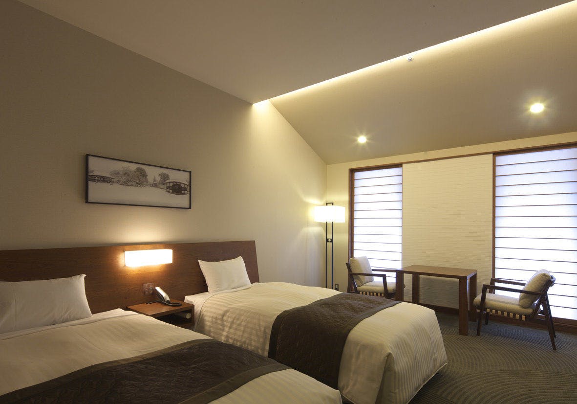 最上級のポケットコイルスプリングマットレス、デュベなど快適さにこだわったツインルーム。陽あたりのよい南向きのお部屋です。シンプルなインテリアの中にも上質さにこだわりました。お部屋の広さは25平米で1名様から3名様のお部屋となっております。個別空調で暑い、寒いをご自分の体調に合わせてコントロール出来て居心地の良いお部屋となっております。※全室 WiFi御利用いただけます。
