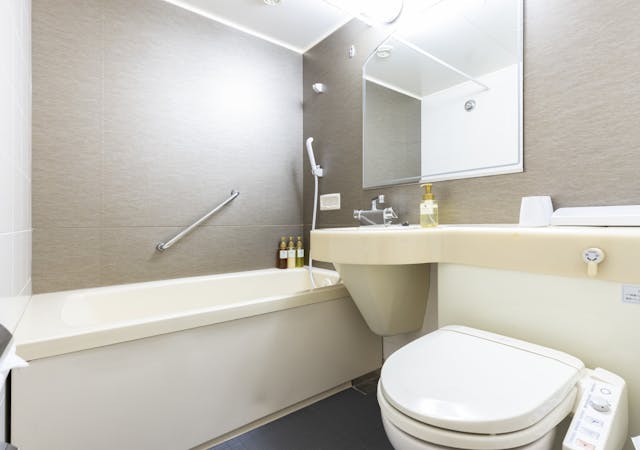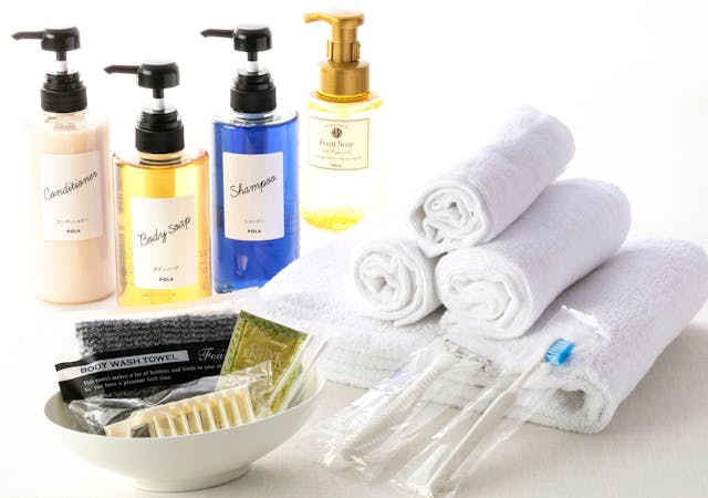 バスタオル、フェイスタオル、歯ブラシセット、ボディスポンジ、カミソリ、くし、ボディソープ、シャンプー、コンディショナー、ドライヤー、パジャマ、使い捨てスリッパ、湯沸かしポット