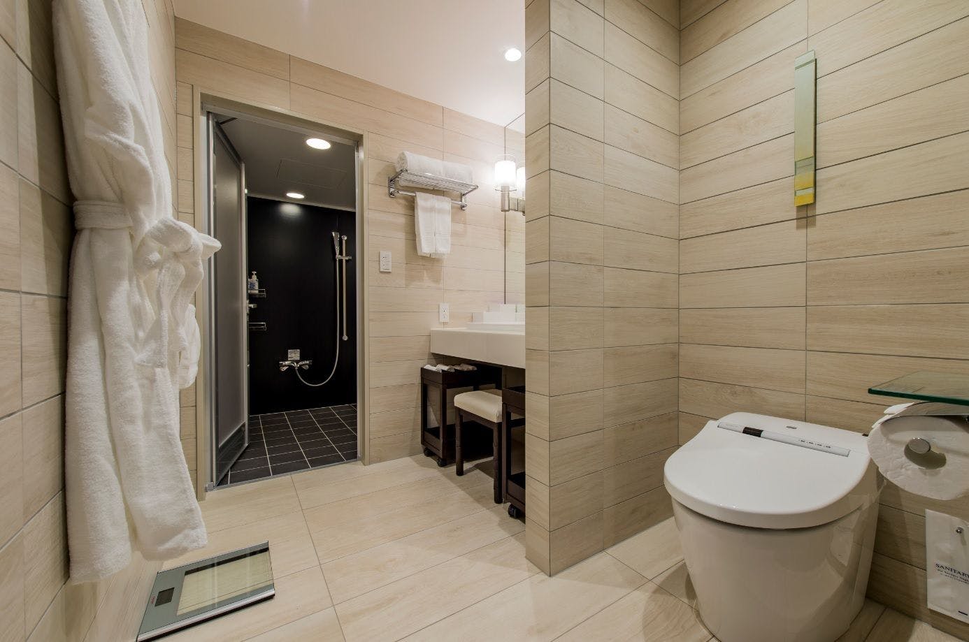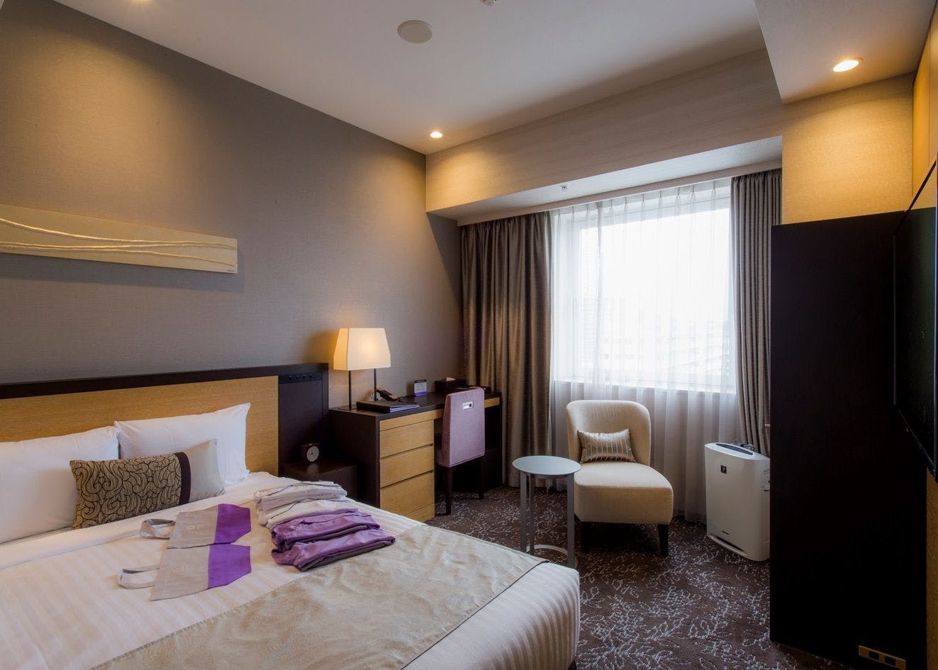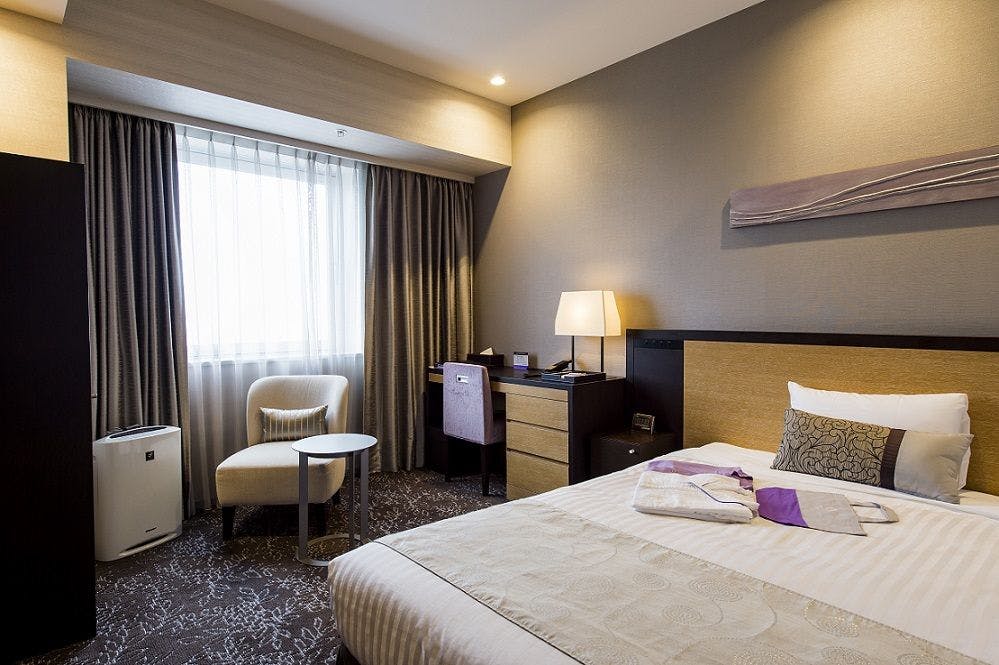 プレミアムダブルルームは、26平米の広さのあるお部屋に、ゆったりと180cmのキングサイズベットを入れ、モダンな空間をご用意しております。クローゼットもあり、長期でのご滞在も快適にお過ごしいただけます。また、広々としたベッドはファミリーでのステイにも適しています。健康増進法の改正に伴い、喫煙部屋でのお子様の添寝・20歳未満の方のご利用はできかねます。