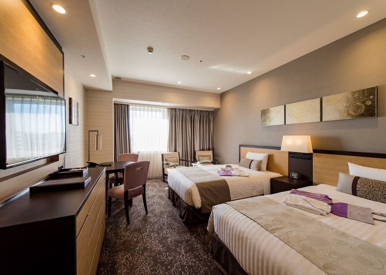 当ホテルで一番広い特別なお部屋、スイートルーム。広々としたベッドにソファ。疲れをゆったりと癒やしていただけます。(140センチベッド2台となります。簡易ベッドはいれられません。)