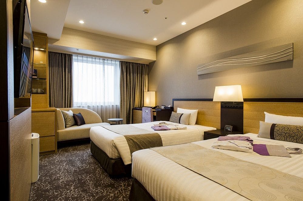 おふたりでゆったり過ごせるツインルーム。ソファでゆっくり旅行の思い出をお話しください。健康増進法の改正に伴い、喫煙部屋でのお子様の添寝・20歳未満の方のご利用はできかねます。