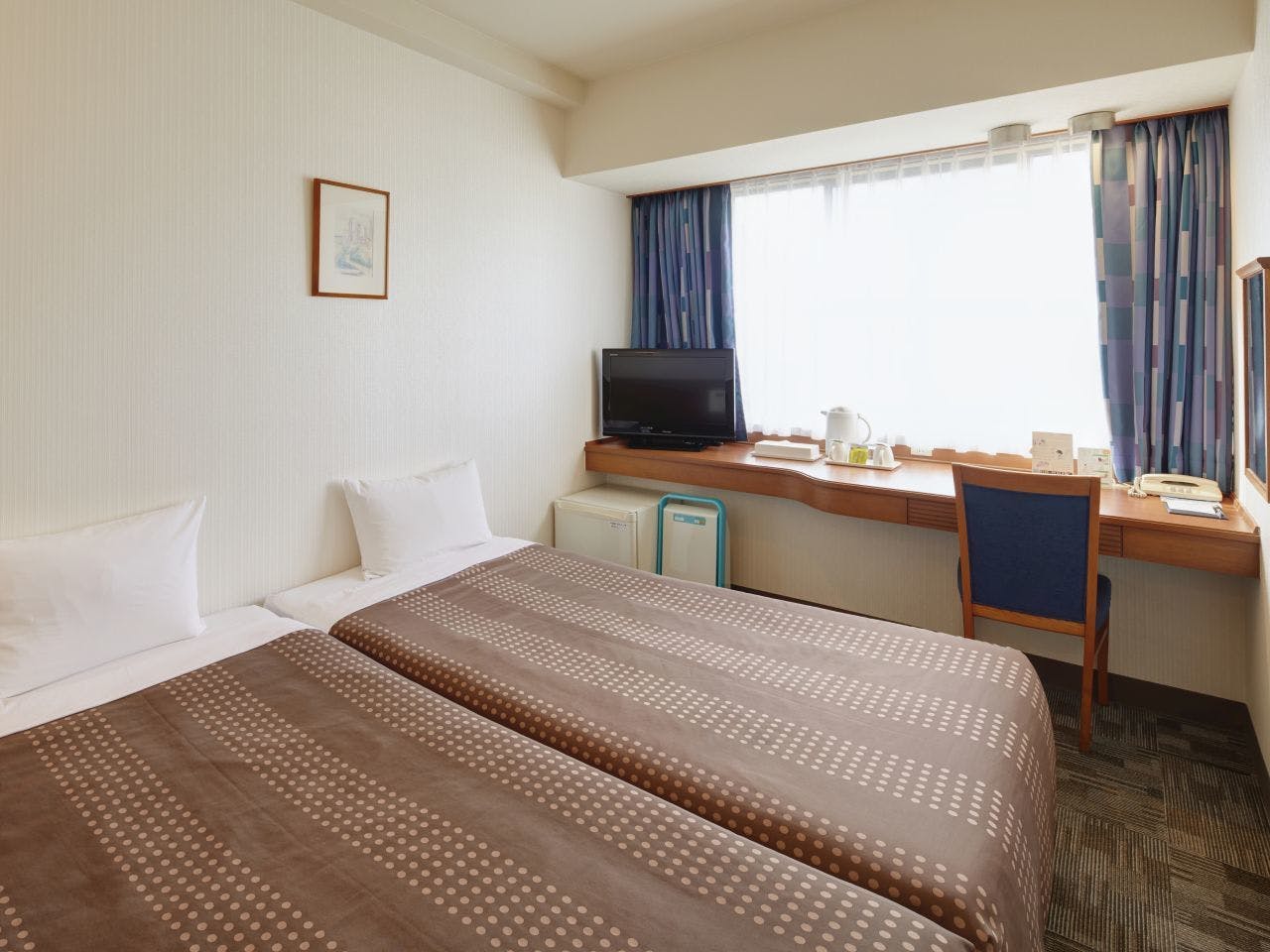 14平米のお部屋にシングルベッドを2台設置した小さめでお手頃なツインルームです。