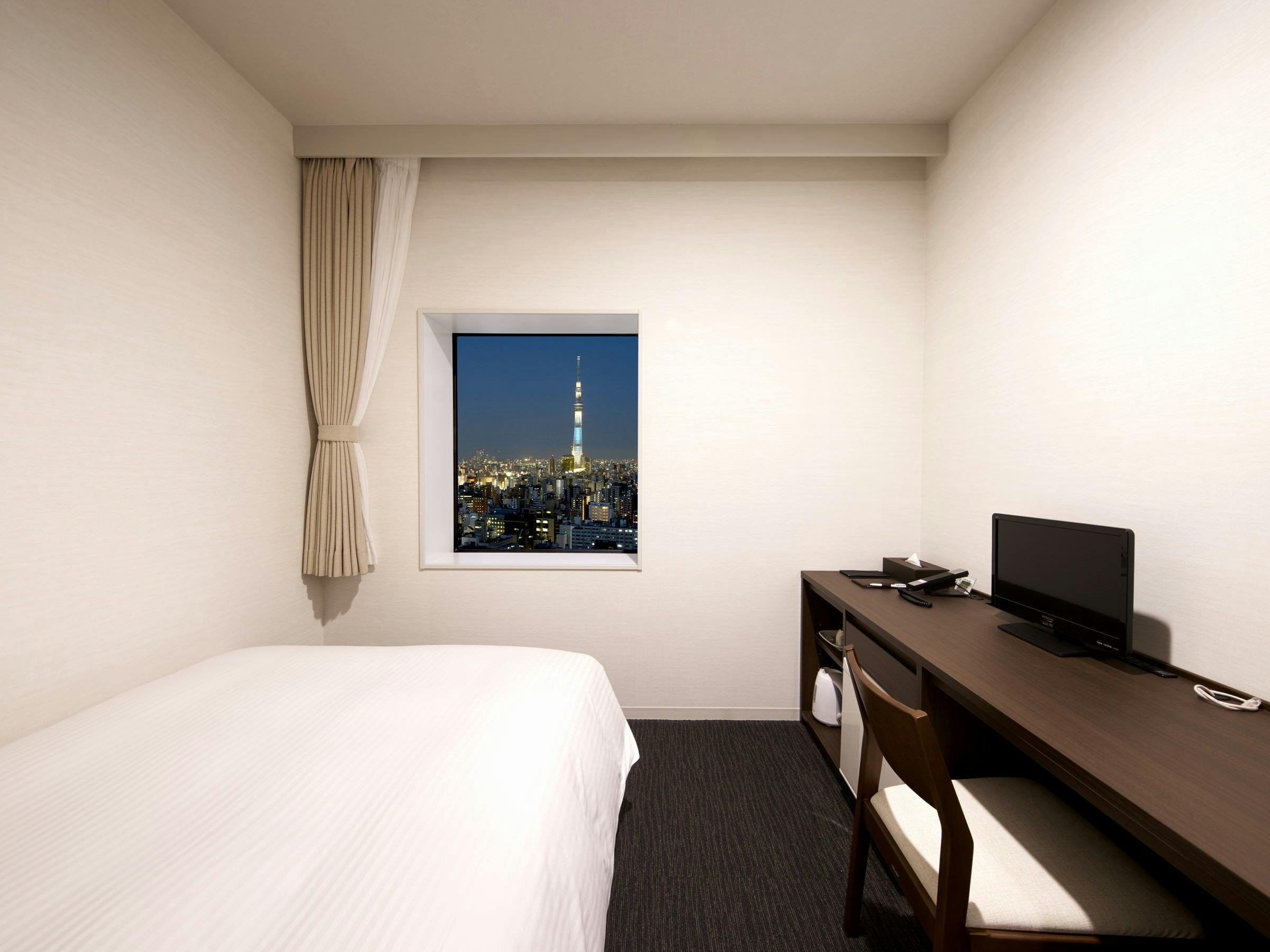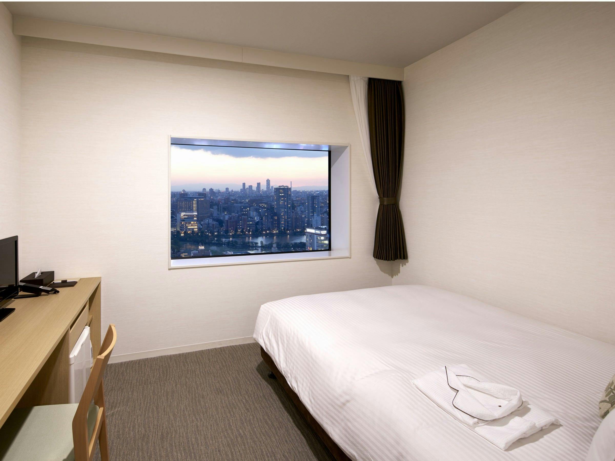 東京スカイツリー(R)が窓から見えるお部屋です。機能性を重視したコンパクトなシングルルームは、ビジネスにもおすすめです。セミダブルサイズ(幅120cm)のベッドで、ゆったりお寛ぎください。