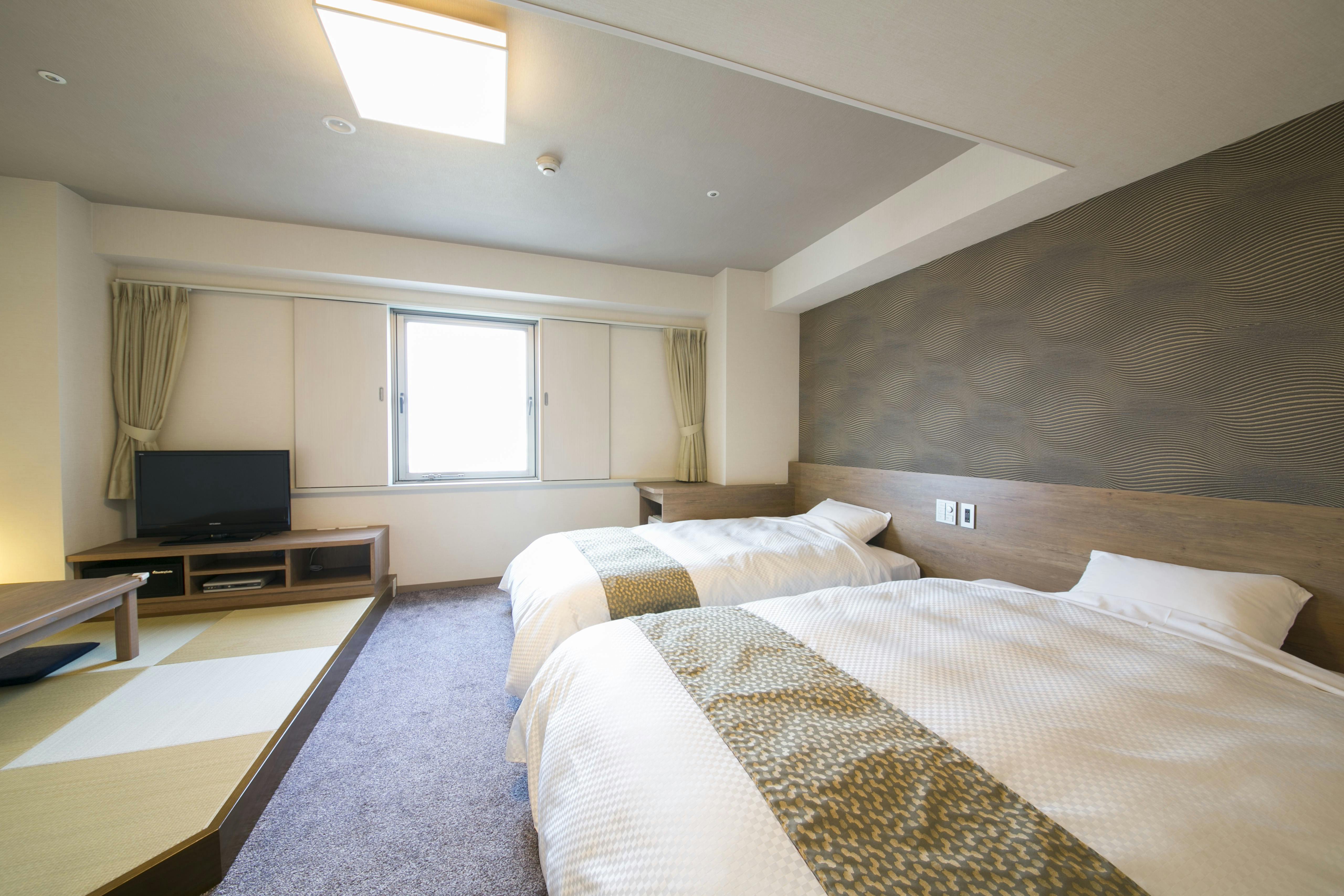リビングスペースは畳の小上がりにして和室のテイストを取り入れました。靴を脱いでくつろぐ居住空間は、まるでご自宅にいるかのような清潔感とやすらぎがあります。小さなお子様連れのご家族にも安心してご利用いただけるお部屋です。さらに畳スペースにお布団をご用意して1名様がお休みいただけますので最大で3名様までご案内が可能です。