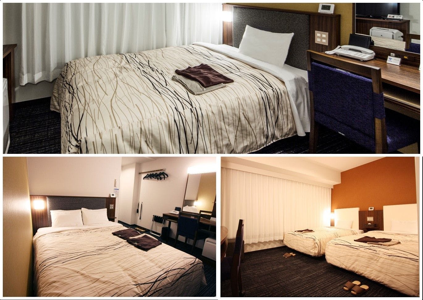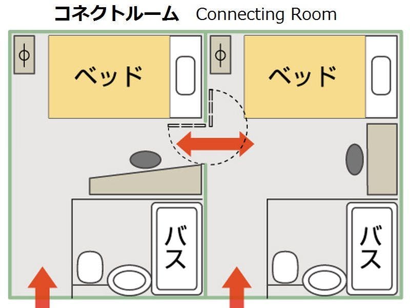 隣同士の13平米のダブルルーム2部屋が室内の扉で行き来可能なコネクティングルーム(ベッドはダブルベッド×2台、4名利用時は各ベッドでそれぞれ2名様ずつお休みいただきます)、Free Wi-Fi、高速有線LAN、加湿空気清浄機、個別空調、サータブランドベッド、32インチ液晶テレビ、枕元コンセント