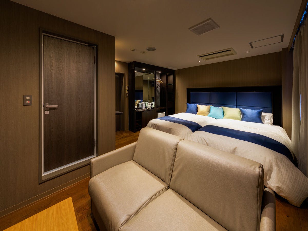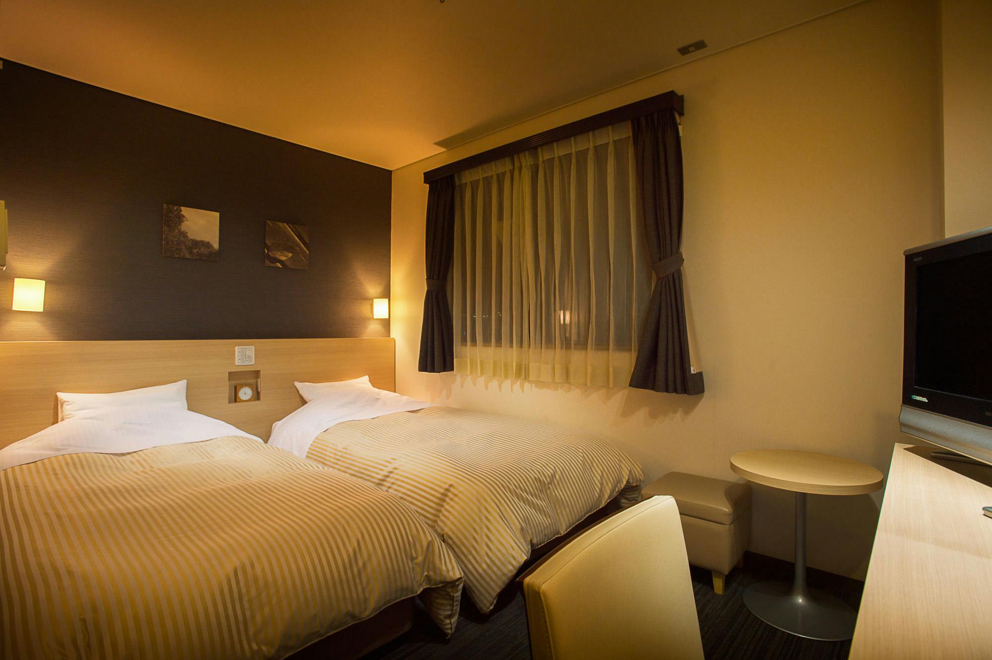 ツインルーム17~18平米のシックなデザインのお部屋・シモンズベッド・シングルサイズ(100cm×195cm)×2台・ユニットバス・温水洗浄トイレ・液晶テレビ・湯沸し用電気ポット・無料Wi-Fi・加湿空気清浄機※全室ベッドメイクは「デュベスタイル」となります