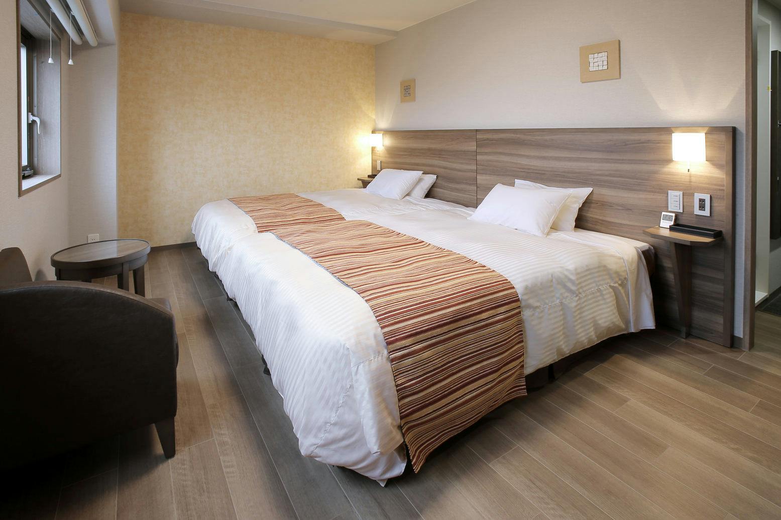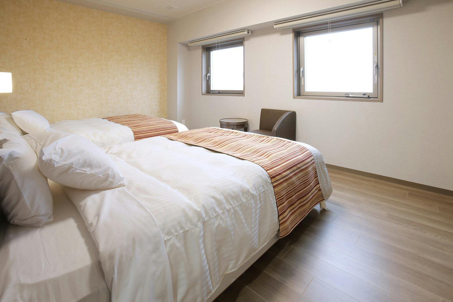 禁煙ルームです。140cm幅のダブルベッドを2台配置した、ご家族にお勧めの広めのお部屋です。エアウィーヴマットレスを全室に導入しております。