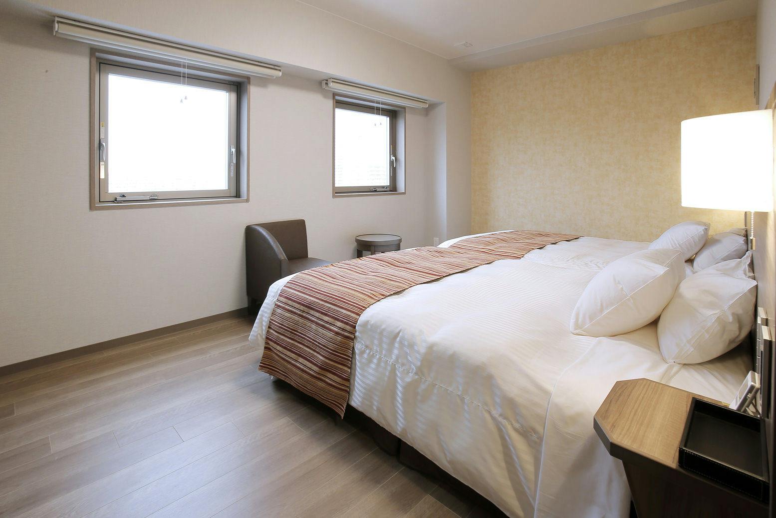 禁煙ルームです。バリアフリーの客室にクイーンサイズ(160×208)のダブルベッドを1台設置しております。3名様でご利用の場合、スタッキングベッドを追加で1台設置いたします。