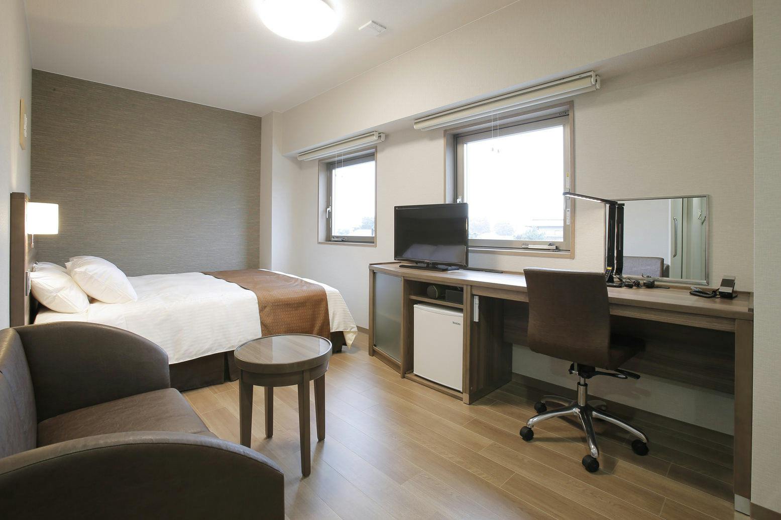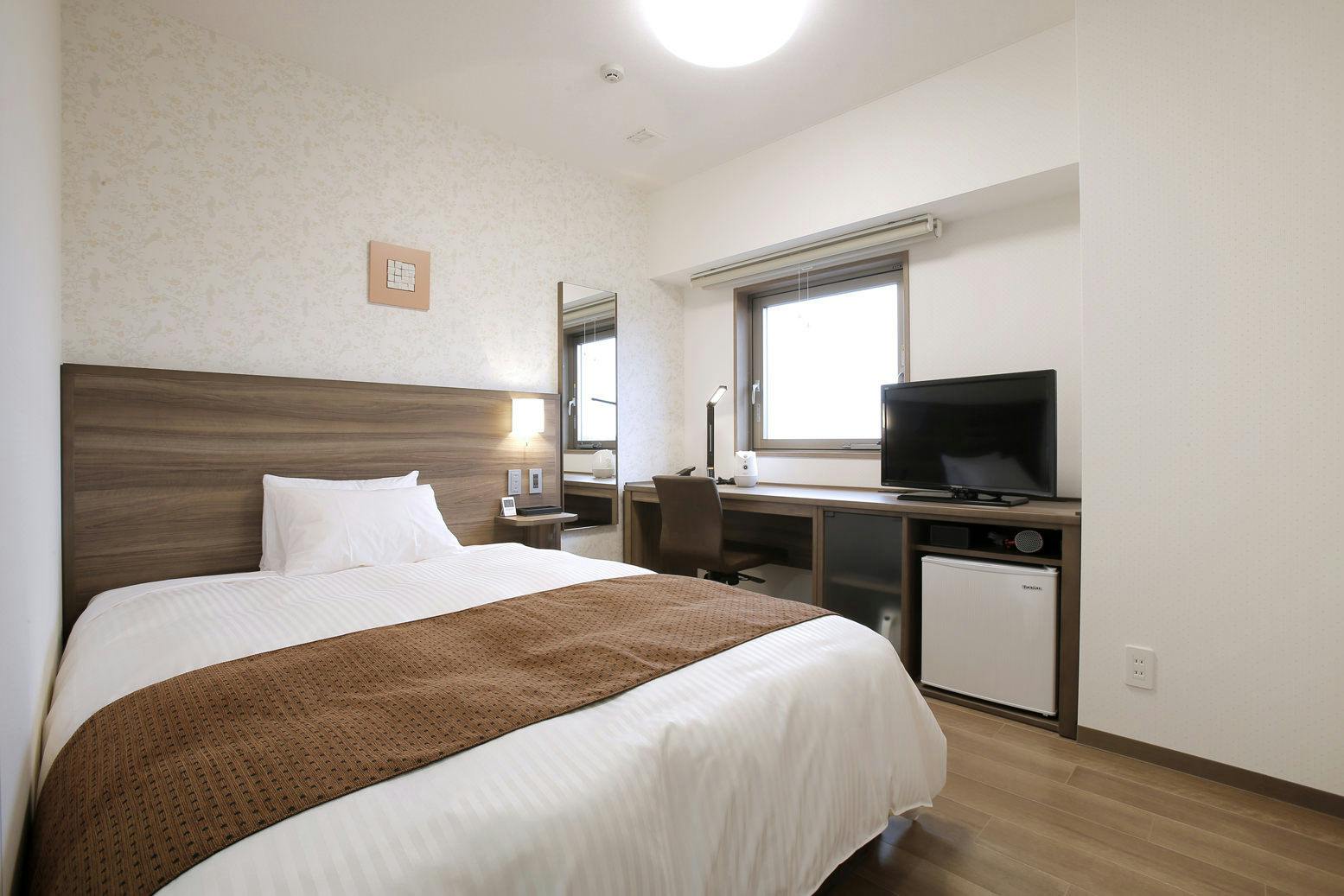 禁煙ルームです。140cm幅のダブルベッドを1台配置したスタンダードタイプのお部屋です。 エアウィーヴマットレスを全室に導入しております。