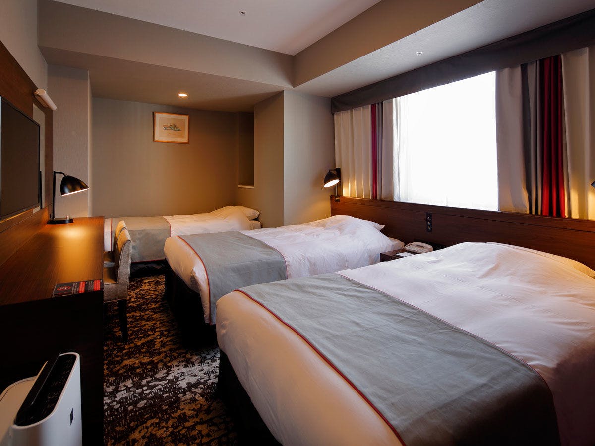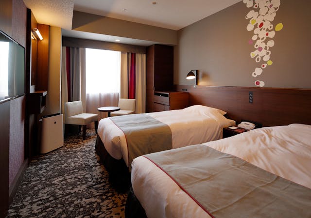 明るい色調で清潔感のある客室空間がお客様をおもてなしします。ブドウをイメージしたデザインを要所に散りばめ、ボルドー色の壁面に浮かぶアートがお客様を非日常へと誘います。