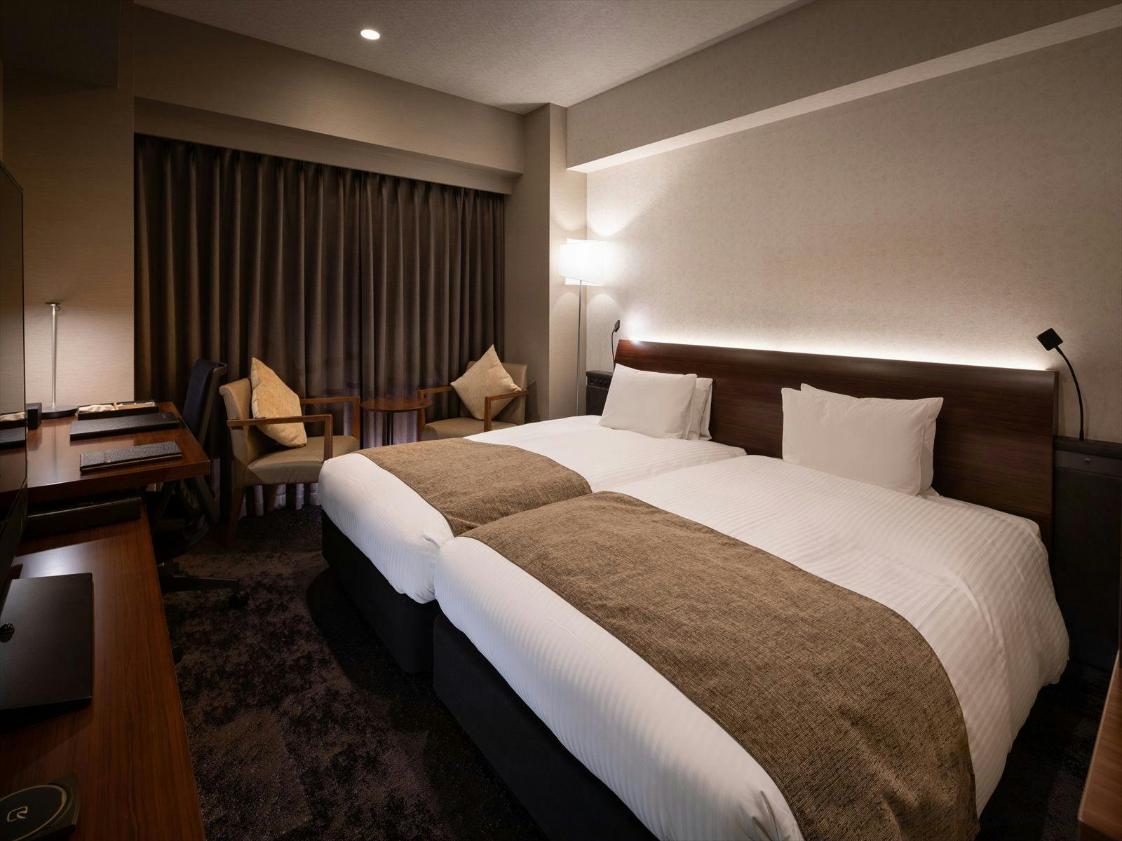 <モデレートツインルーム>【広さ】26平米【ベッドサイズ】110cm×195cm【バスルーム】セパレートバスルーム【お部屋の設備】■各社対応携帯電話充電器■インターネット接続無料(有線LAN・無線LAN対応可)■50型液晶テレビ■コルビー社製ズボンプレッサー設置■電気ポット■加湿機能付空気清浄機■暖房便座付シャワートイレ